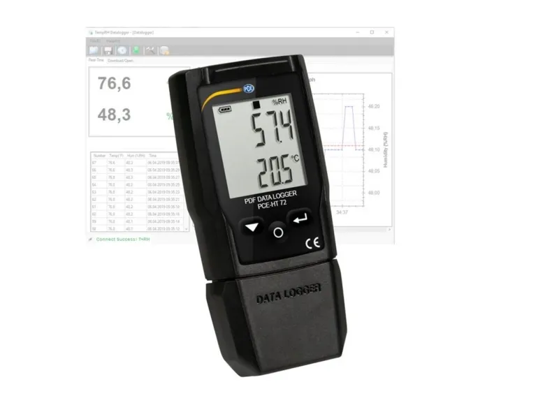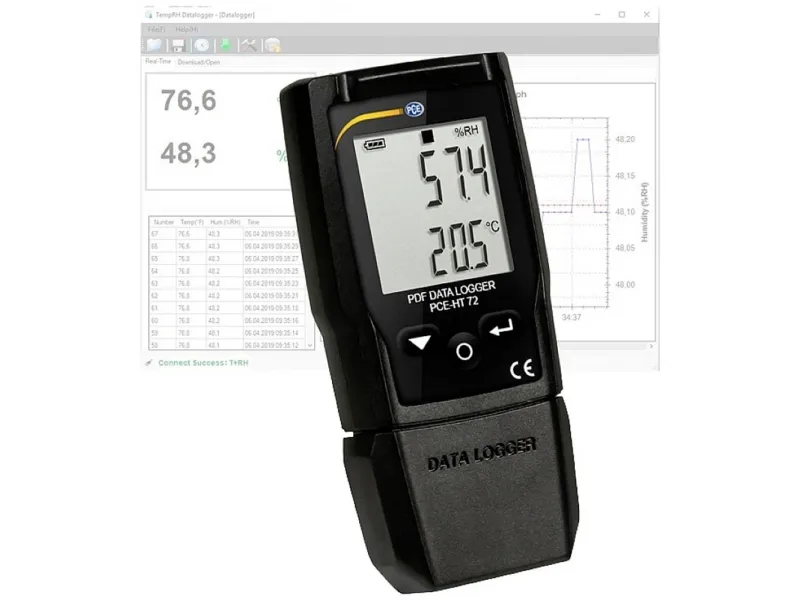 PDF-DATALOGGER PCE-HT 72PDF-datalogger PCE-HT 72 PDF-datalogger til temperatur og luftfugtighed / rapport som PDF-fil / software til programmering / PDF-datalogger med display / Export som CSV gør PDF-dataloggere det muligt at registrere forskellige parametre som omgivelsestemperaturer eller luftfugtighed over længere perioder. Dataloggerne konfigureres som regel før målingen, så måleparametrene registreres i overensstemmelse med den indstillede optagehastighed i flere dage, uger eller måneder på de valgte målesteder. PDF-dataloggeren PCE-HT 72 fra PCE Instruments er en datalogger til temperatur og luftfugtighed. Måleområdet ligger mellem -30 … 60 °C og 0 … 100 % RF En hukommelse til 20010 kabler med måleværdier gør det muligt at bruge PDF-dataloggeren op til flere måneder. Lagringsintervallet kan derved indstilles i området mellem 2 sekunder og 24 timer. Til konfiguration af dataloggeren kan denne forbindes med computerens USB-tilslutning, og derefter kan den konfigureres via softwaren