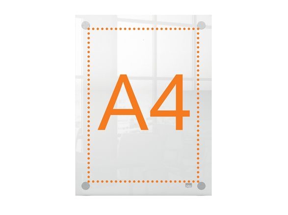 This wall mounted acrylic poster frame with modern frameless design has a stylish and contemporary feel. The seamless acrylic poster frame with through corner fixings allows quick and simple content exchange in a portrait or landscape format whilst protecting your documents. The acrylic surface can be easily wiped clean making this sign holder the an ideal solution for the display of temporary or permanent signs, documents or information. Display area size A4.