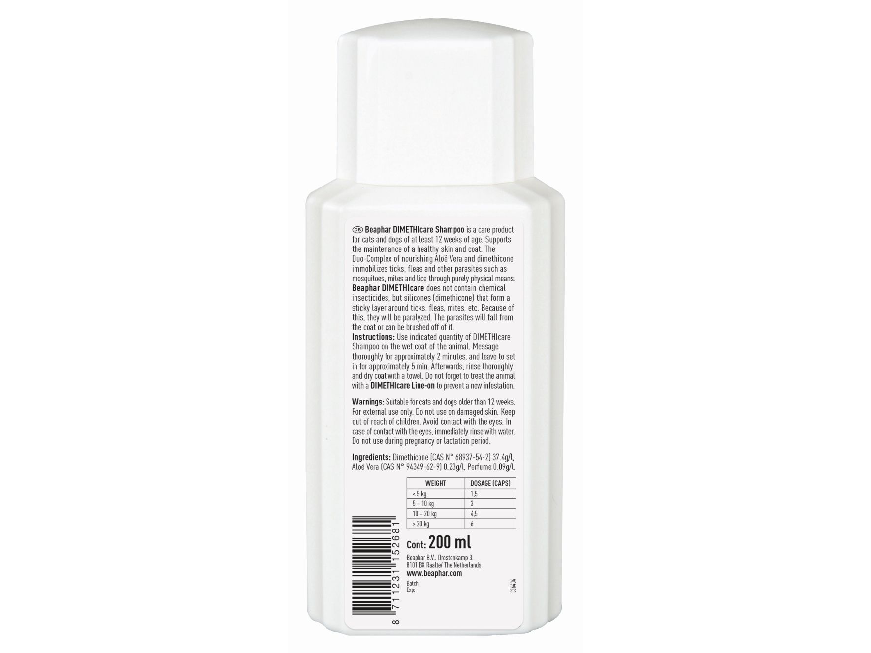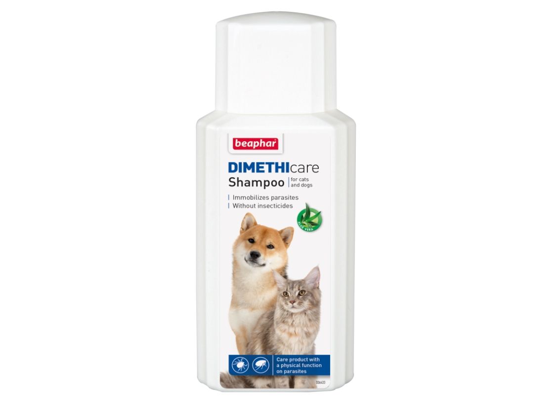 Beaphar Flea & amp; Fästingschampo (Dimethicone) för katter och hundar. Beaphar Dimethicare schampo för hund och katt är ett vårdschampo som kan användas från 12 veckor. Kombinationen av den näringsrika Aloe Vera och Dimethicone säkerställer att fästingar, löss och loppor inte kan röra sig, kapsla in och inte överleva. Detta är ett schampo som är en idealisk produkt för skadedjursbekämpning. 100% naturligt. Huvudingrediensen är en naturlig silikon som sveper runt parasiten och förhindrar att den rör sig och så småningom dör. En annan huvudingrediens är Aloe Vera. Den har en mjukgörande och närande effekt på hud och päls. Det är en ingrediens som också är känd för sina läkande egenskaper.