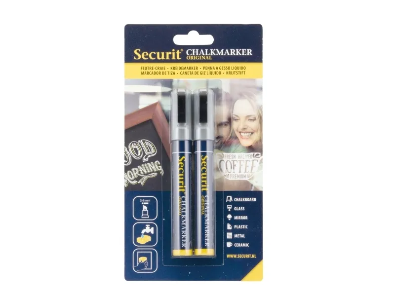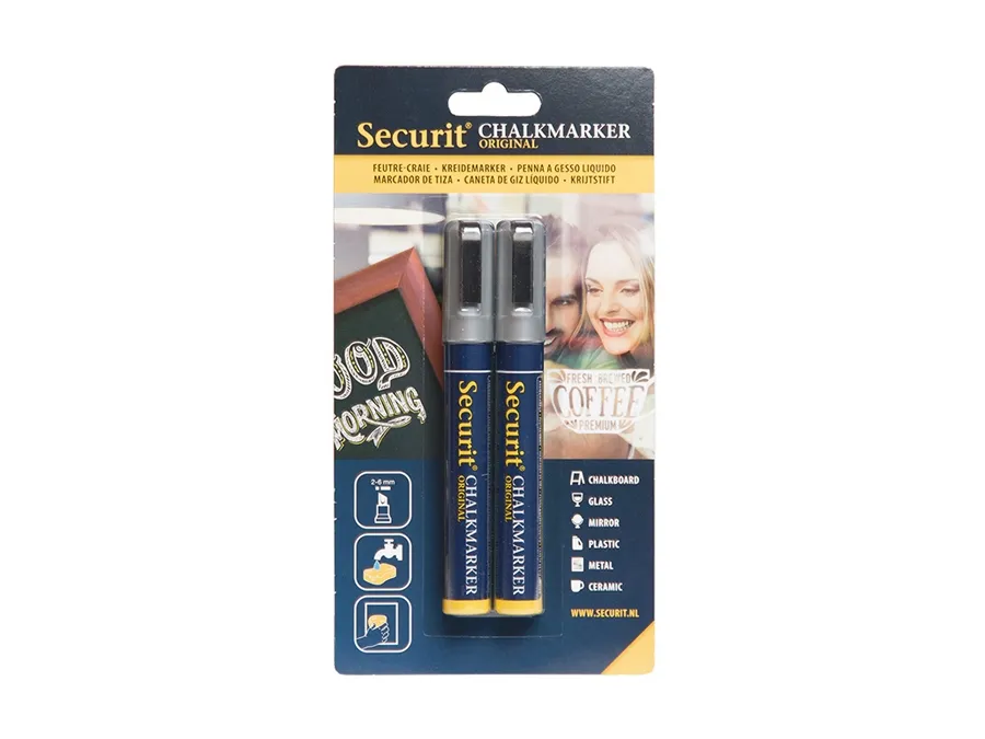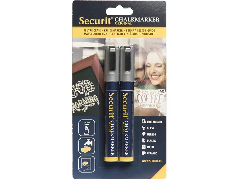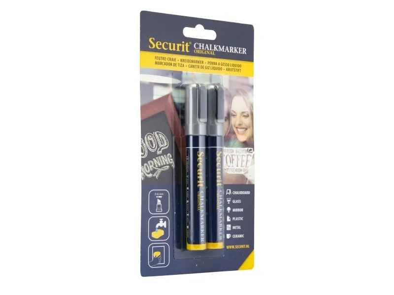 • varianterSecurit® Original kridtmarker er gennem årene blevet videreudviklet, og er stadig verdens bedste kridtmarker. Dette sæt indeholder to kridtmarkere i farven sølv. Giftfrie, meget uigennemsigtige flydende kridtmarkere med en 2–6 mm skrå spids. Tværer ikke ud når det er tørret . Velegnet til alle ikke-porøse overflader. Let at bruge: ryste pennen,