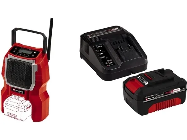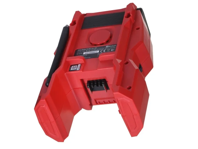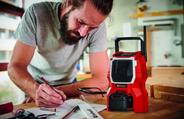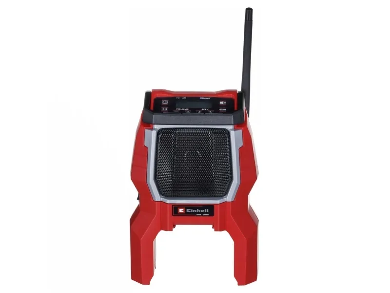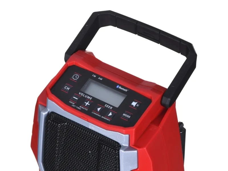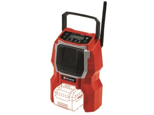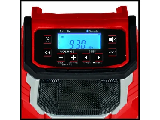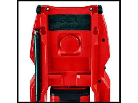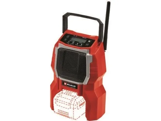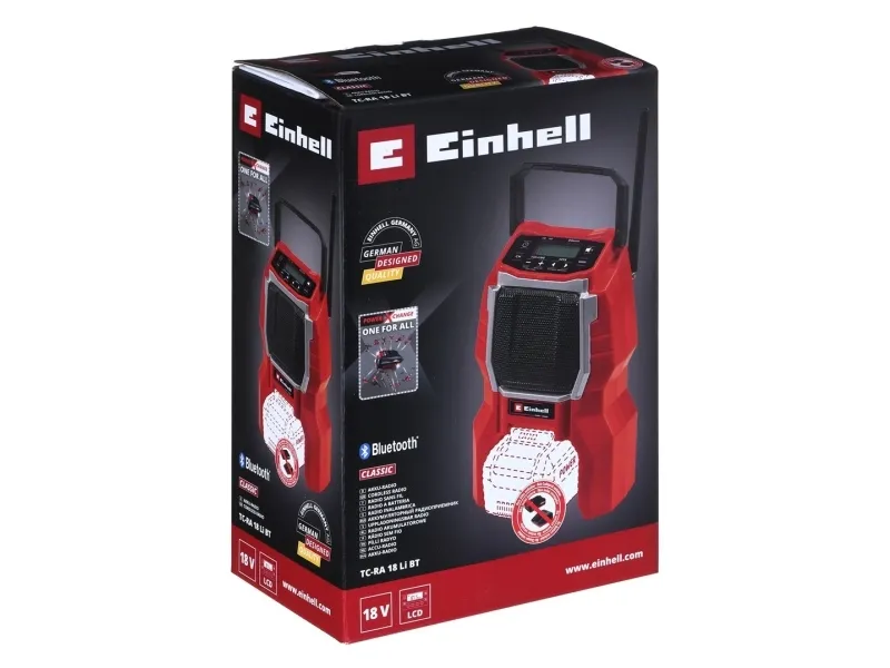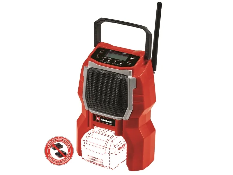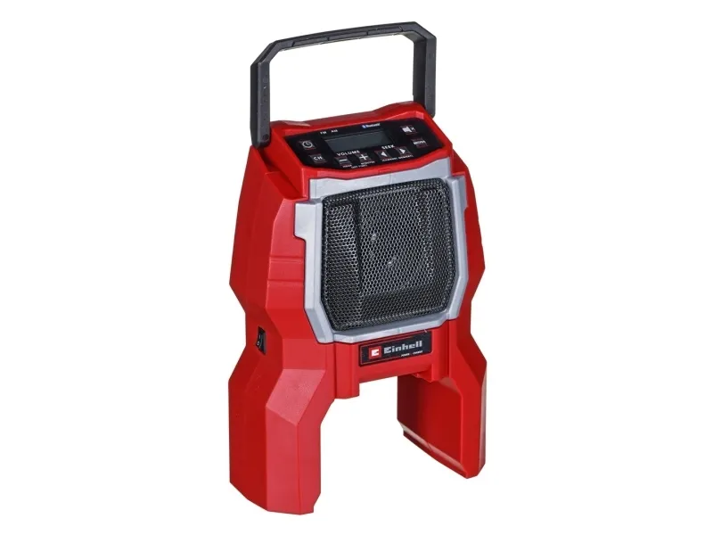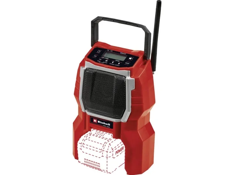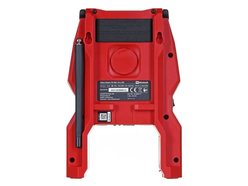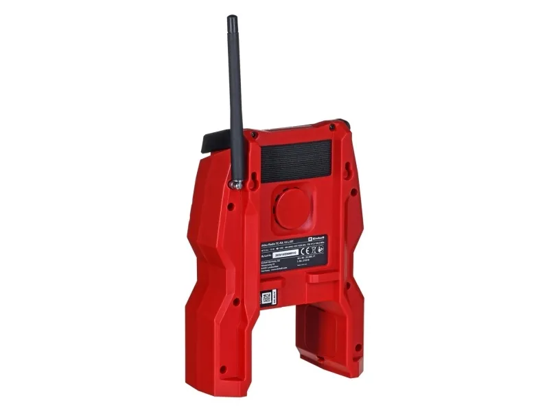 The Einhell TC-RA 18 Li BT Solo cordless radio is a practical and rugged companion for the workshed, basement, building site and garage. As a member of the Power X-Change family it is both a high performer and a tough performer. This handy cordless radio has ten memory presets for AM frequency stations and another ten for FM. Connecting the cordless radio to a smartphone is easy using Bluetooth. Safe storage for your smartphone or other small devices is provided on the back of the radio. The time is shown on the high-grade LCD. Intuitive operating options around the display supplement the user-friendly design. The antenna can be folded for space-saving storage. This cordless radio is also prepared for easy fastening to a wall. A practical carry-handle enables comfortable transportation. This product comes without a battery and charger from the Power X-Change series; these items are available separately, e.g. as a practical starter set.