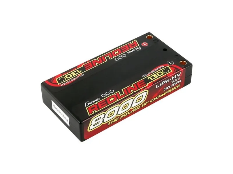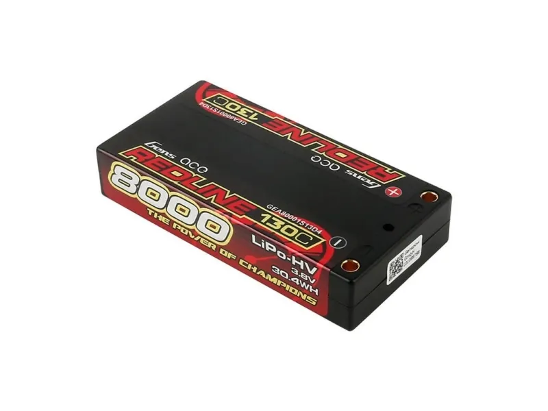 Gens Ace Redline Series 1S 130C 8000mAh Hardcase LiPo Battery Pack, with a factory installed 4.0mm bullet. Consumers trust the Gens Ace name to deliver the dependability and high performance they expect. The Gens Ace 130C 1S 8000mAh 3.8V HV LiPo battery pack has a high-capacity, high-discharge rate that gives you the power and run-time you expect .