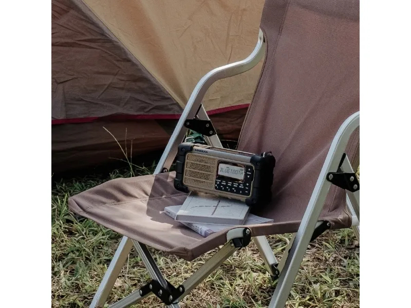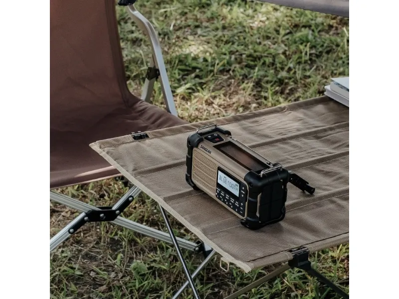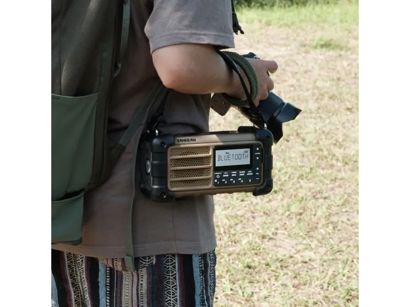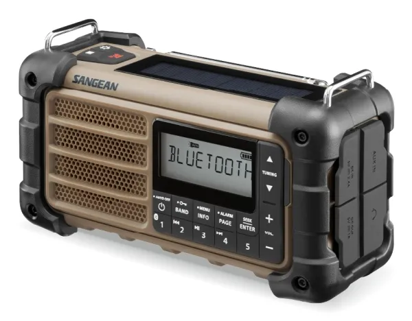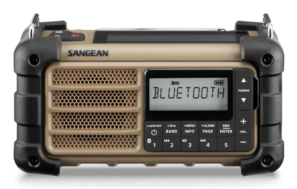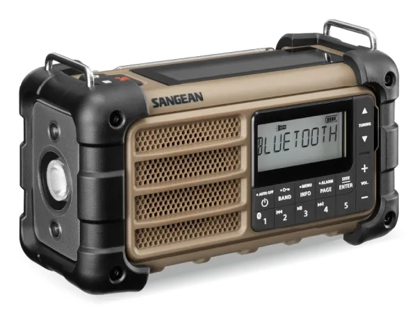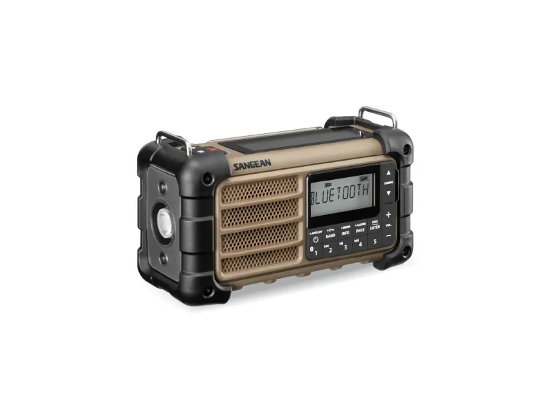 Sangean MMR-99 AM/FM Desert Tan AM/FM-RDS/Bluetooth/AUX/hånd chrank + Solar RadioAM/FM-RBDS/BLUETOOTH · 40 hukommelsespladser (20 AM/20 FM) · ATS (Auto Tuning System) · FM-softmute-funktion · Indstillelig AM/FM-båndbredde · FM-mono/stereo-kontakt · Strømforsyning med håndsving/solstrøm/DC-in (USB type-C) til genopladeligt litium-batteri · LED-indikatorer for batteriniveau og ladetilstand · Indstillelig 5-tilstand-LED-lommelygte (høj-/dyb/bred&fokuseret/blinklys/SOS/morse-kode) · Rødt lys-lommelygte for optimalt nattesyn · Indbygget nødlysmekanisme til uventede strømudfald · Indbygget ur · Indbygget Premium-højttaler · Alarmtimer med 7 forskellige summertrin · Lydstyrkeregulering (til/fra) · Indstillelig timer til baggrundsbelysning · Valgbar auto-off-tilstand · IP55-klassificering for støv- og vandtæthed · Robust konstruktion til ekstreme betingelser · Praktisk størrelse til maksimal mobilitet · AUX-indgang til ekstra lydkilder · Stereo-hovedtelefontilslutning · DC-udgang (5