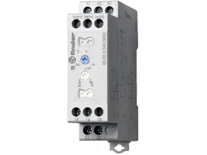 Multifunktionstimer 12A 2C/O, 22,5 mm, flerspänning. 24-240VAC/DC, 8 kopplingspunkter. 8 tidsintervall. 0,05s-10 dagar.