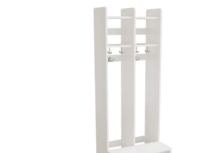 Garderob Eira Light golvmodell - 3 avdelningar på bredden med avdelare, krokstång, bänk och skohylla. Vitpigmenterad björkplywood. Bänken är täckt med vit laminat. B x D x H, 720 x 250/450 x 1500 mm (rymdbredd 220 mm) FSC-certifierat material