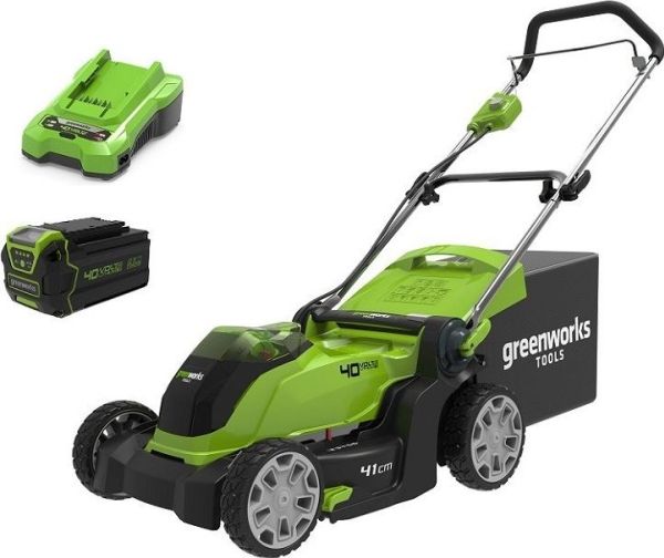 Innehåll i paketet 1 x Greenworks G40LM41 Gräsklippare 41cm 40V 1 x Greenworks G40B4 40V 4Ah batteri 1 x Greenworks G40C Universalladdare 40V