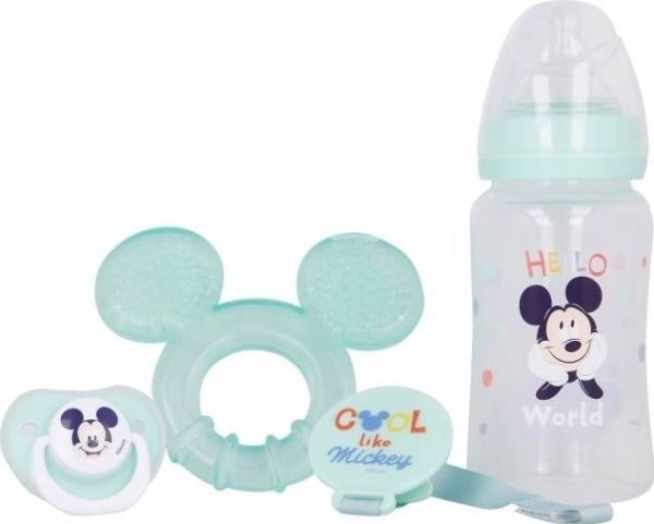 Mickey Mouse babyset (flaska till napp 240 ml, anatomisk napp, bitring, napphållare) (Cool)