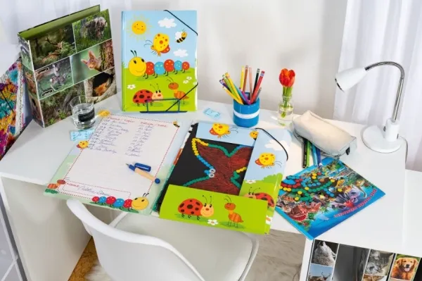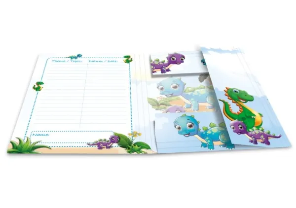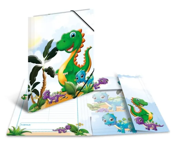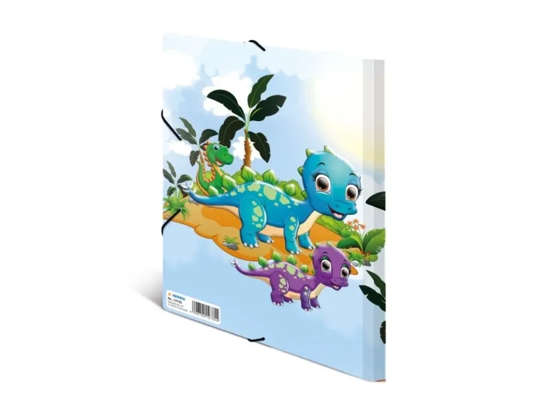 The “Dinos” folder for real adventurers makes it easy for children to store their small works of art. The folder is a great accessory, especially in everyday kindergarten life. Made of solid cardboard, it’s smooth and easy to wipe clean. The colourful and cheerful dinosaurs will appeal to all children and inspire them to dream. The folder is securely closed with an elastic strap and is also very easy to open. This HERMA folder is particularly popular with boys and girls in nursery school, and its beautiful motifs make it an eye-catcher during every handicrafts lesson in the kindergarten. Its A4 format makes it easy to handle and put into schoolbags ready for carrying home. The three interior flaps ensure that loose papers, notes and pictures can be carried without falling out. The folder provides a perfect overview of the contents in kindergarten and nursery school. This material also provides excellent protection against external influences such as dirt, dust and food and drink stains. If you like the cheerful Dino design of this folder, you’ll be glad to hear it’s also available in A3 format, so your child can also store larger sheets from art lessons.