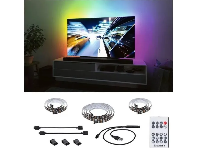 MaxLED-stripsSpektakulære lyseffekter i stuen - USB TV-båndene til 55 tommer Fjernsyn sørger for tresidet belysning bag TV'et. Det indirekte omgivende lys giver med sit behagelige, roligt skiftende, dynamiske farvespil effektfulde lyseffekter. Båndene giver home-entertainment og gaming området kompetent i scene. Den komfortable styring via infrarød fjernbetjening muliggør en nem konfiguration af utallige egne farveforløb.