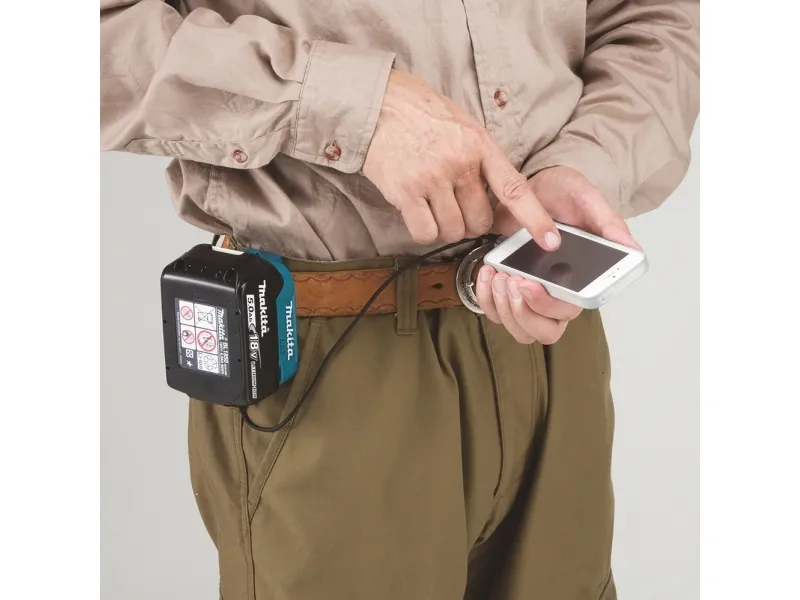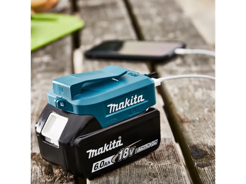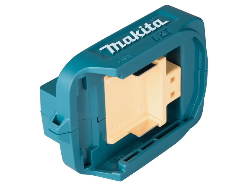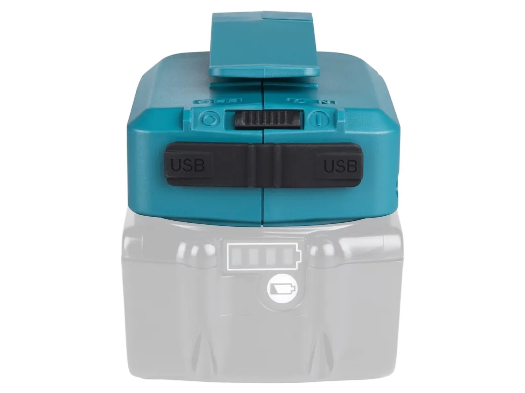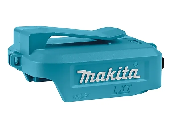 Turn your Makita lithium-ion battery into a charging port with the 18 V LXT lithium-ion cordless power source. Mount the ADP05 on to your compatible Makita lithium-ion battery and you get two USB charging ports. Each USB port delivers 2.1 A output. The built-in clip attaches to a belt or holster, with rubber covers for improved durability.