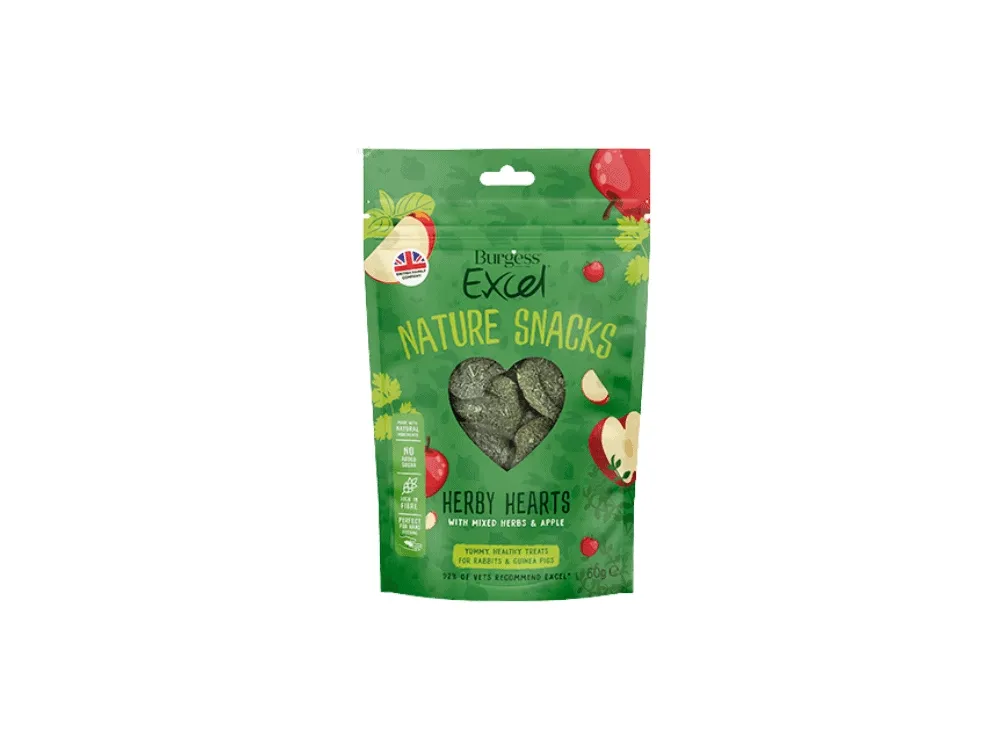 Excel Herby Hearts, bakade godsaker med blandade örter och äpplen. Ett hälsosamt mellanmål för kaniner och marsvin, bra för handutfodring