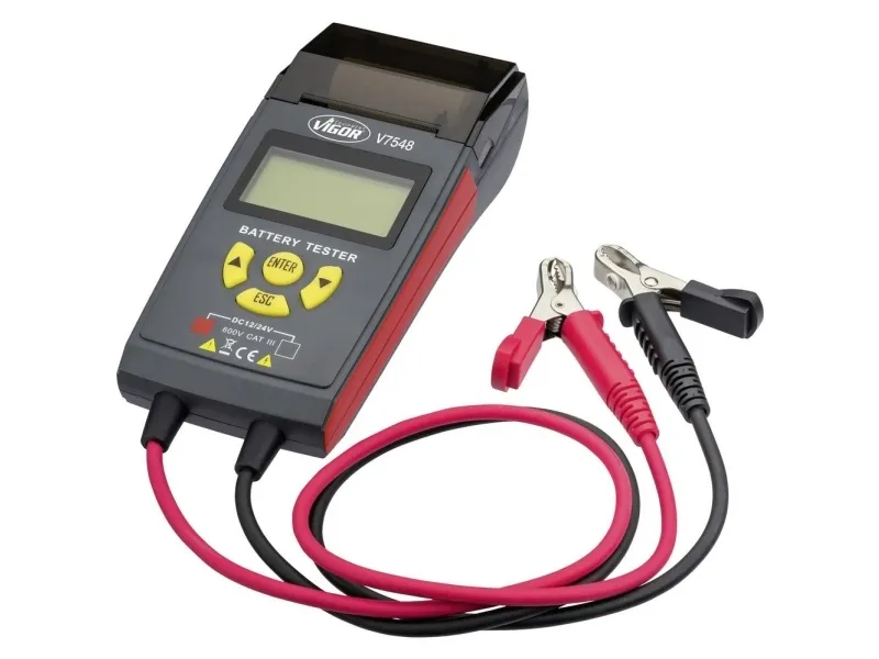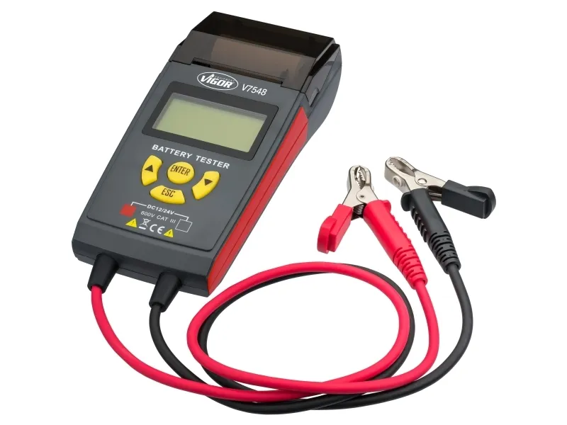BatteritestareKontroll av status för batteri- och laddningssystem (12- och 24 V) lämpliga start-stopp-batterier för personbilar, motorcyklar, skåpbilar och både Funktioner: statusrapport av batteri- och laddningssystem belastningsdisplay när du startar motorn, identifiering av defekta batterier som ett alternativ till testresultatet mobil applikation, Utan kontroll av strömförsörjningen i on- och off-läge, en användarvänlig drift på polaritetsskydd är möjlig, förhindra kortslutning termisk pappersrulle ingår klämkabel längd: 600 mm