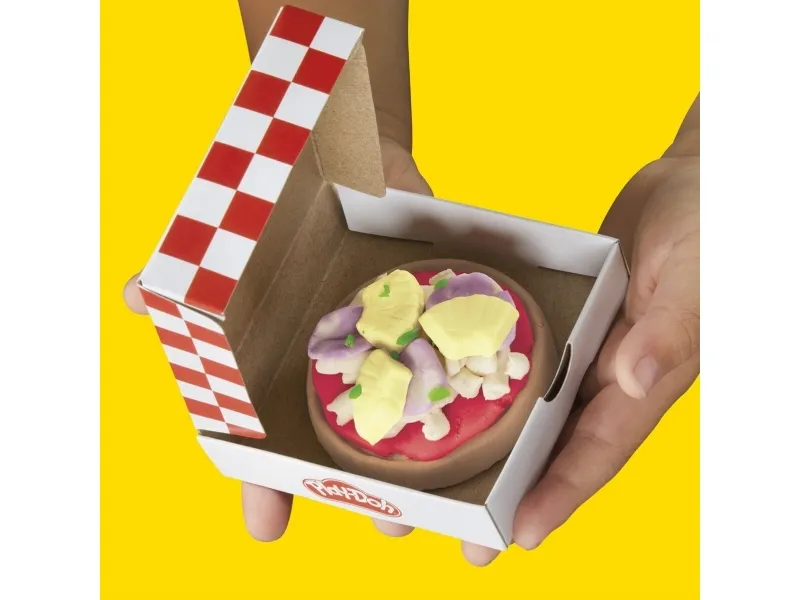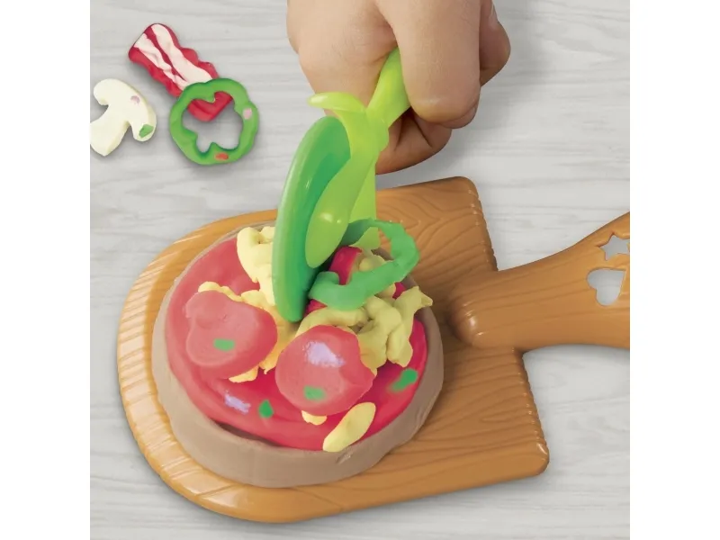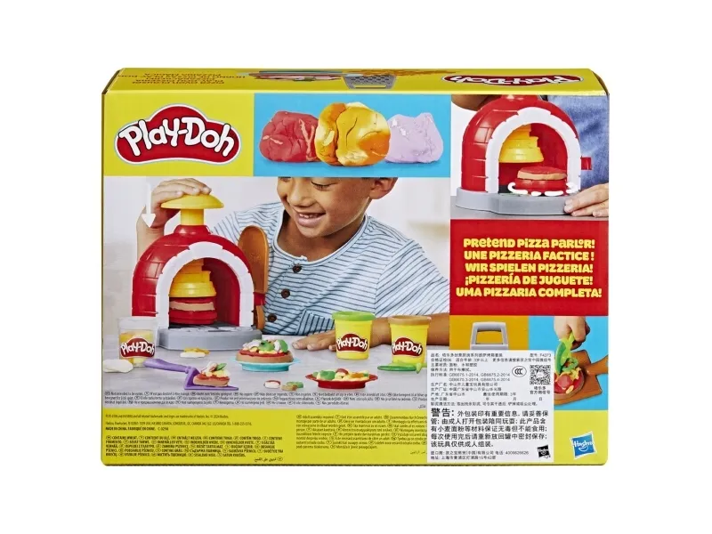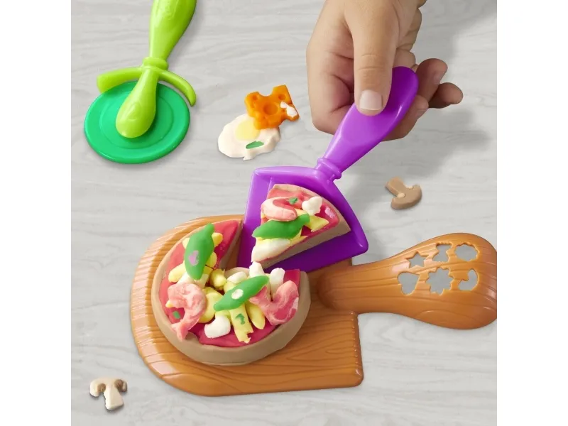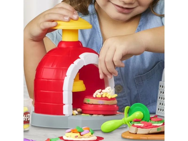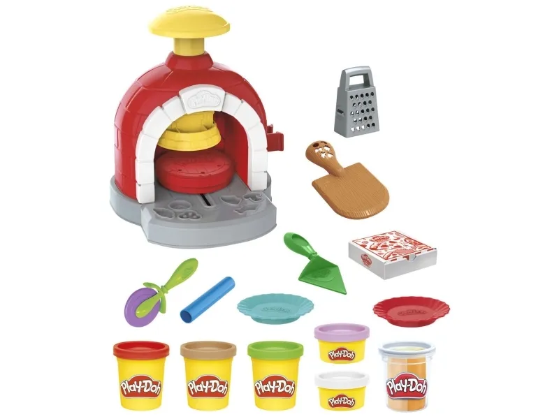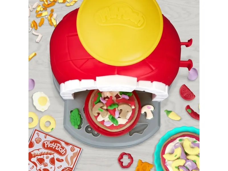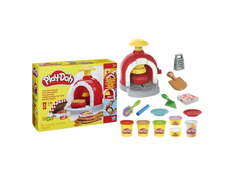 Med denna pizzaugnsleksak är det fantasi som står på menyn! Barnen kan låtsas vara pizzabagare när de trycker ut och formar kreativa pizzor av Play-Doh med fler än 25 möjliga toppingar. Leksetet innehåller åtta verktyg som främjar kreativiteten hos framtida kockar och modellera i sex olika färger varav en burk är trefärgad. Barnen kan även göra sina pizzor redo för leverans med den medföljande pizzakartongen. Play-Doh-setet är en perfekt aktivitet, present eller pysselleksak för barn från 3 år! Hasbro, Play-Doh och alla tillhörande egendomar är varumärken som tillhör Hasbro.