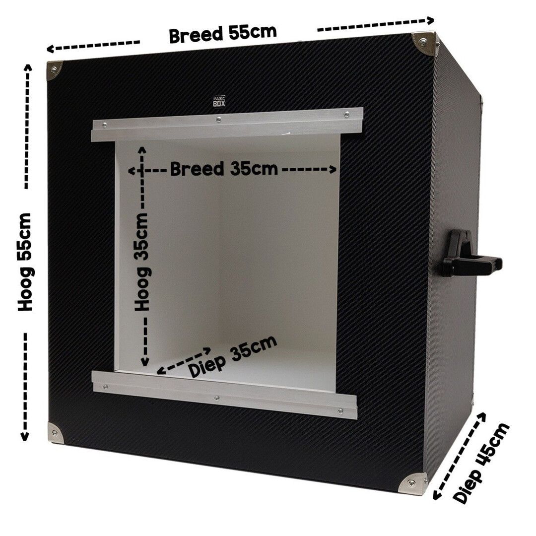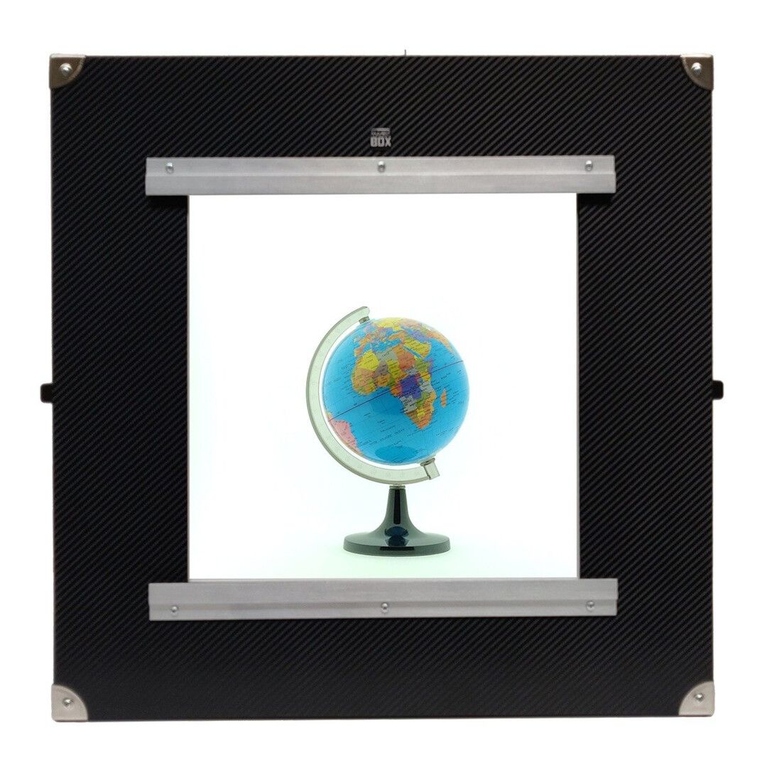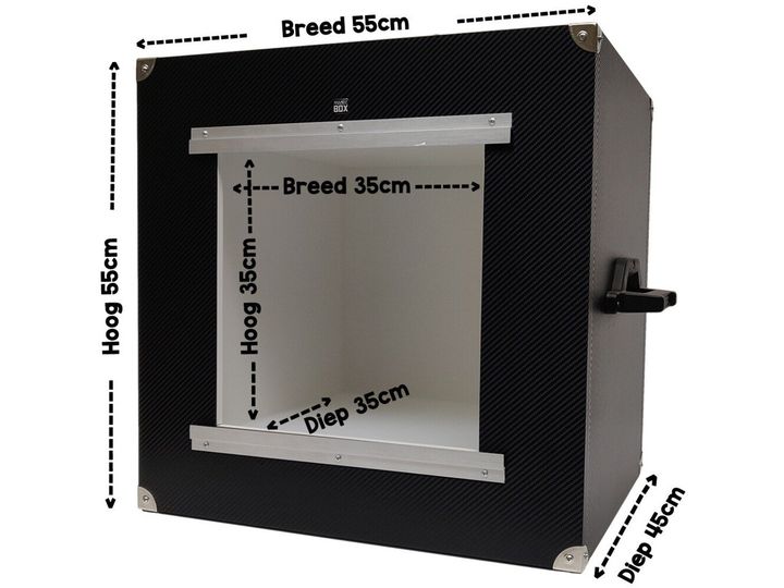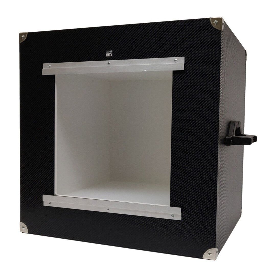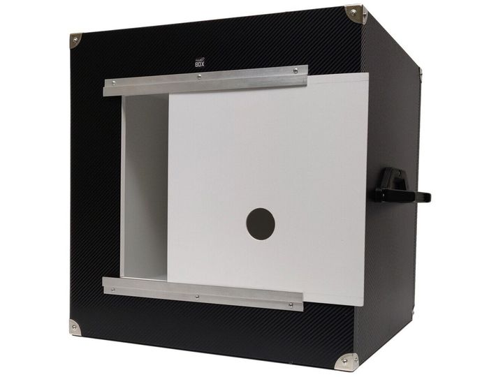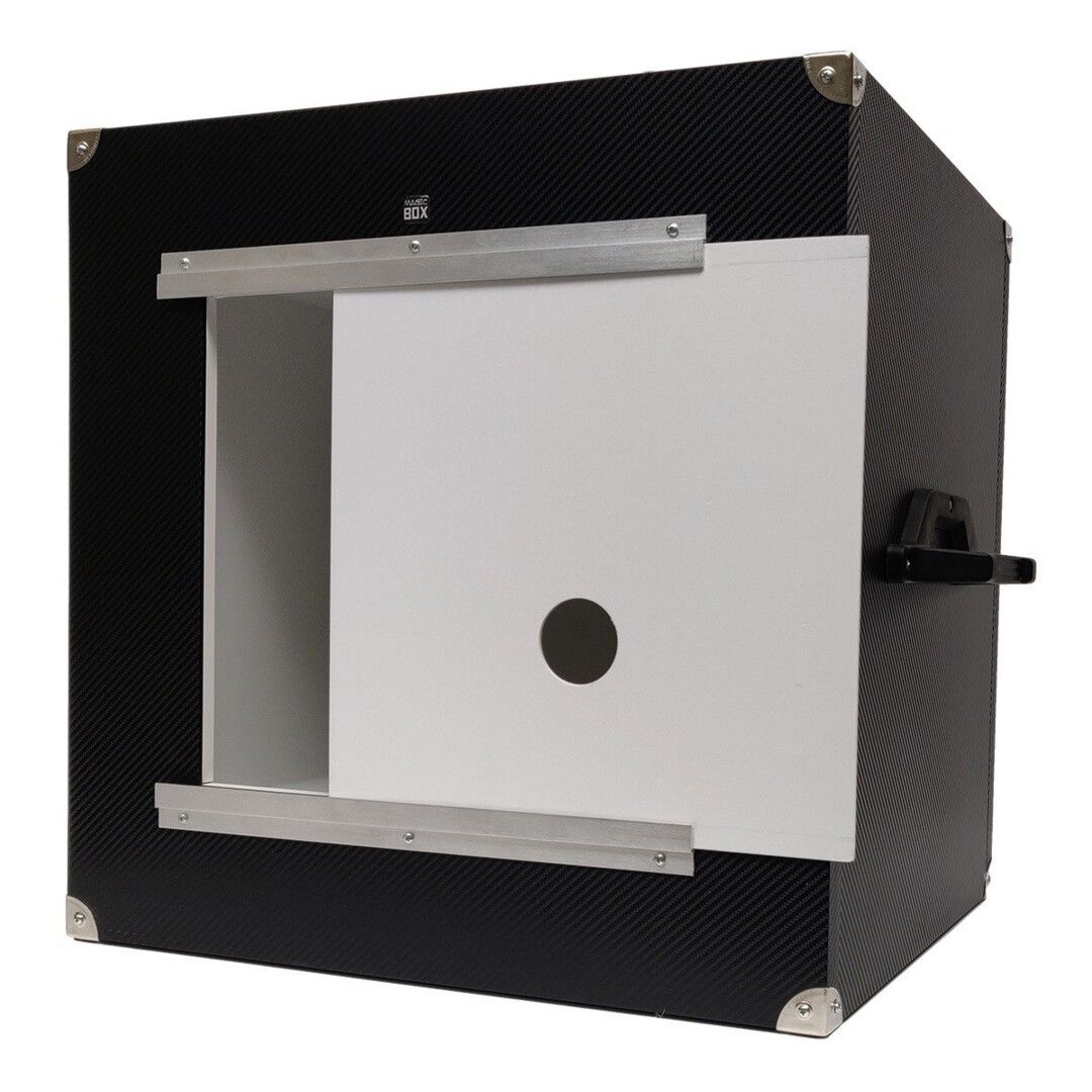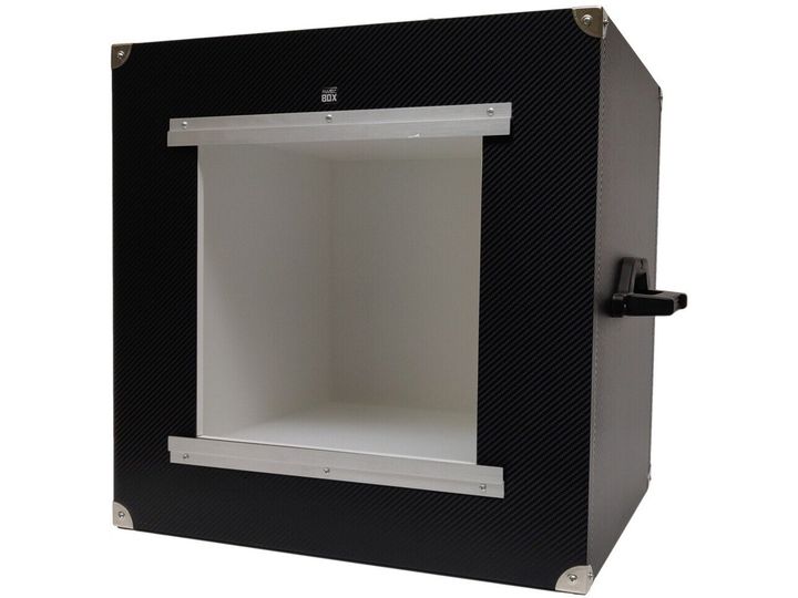 MagicBOX Small har smukt diffust lys fra 5 sider, så du får ingen skygge og en næsten hvid baggrund! MagicBOX Small leveres som standard med en dør med et hul i. For meget spejlende objekter kan billedet tages gennem hullet for minimal refleksion udefra.