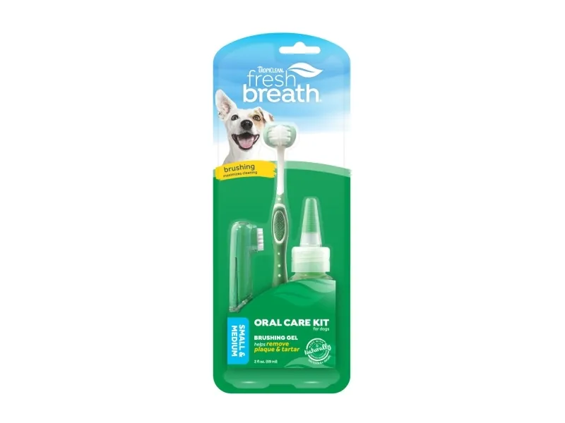 Fresh Breath gel set. Innehåller en fingertandborste och en dubbel tandborste. För mindre hundar och katter.