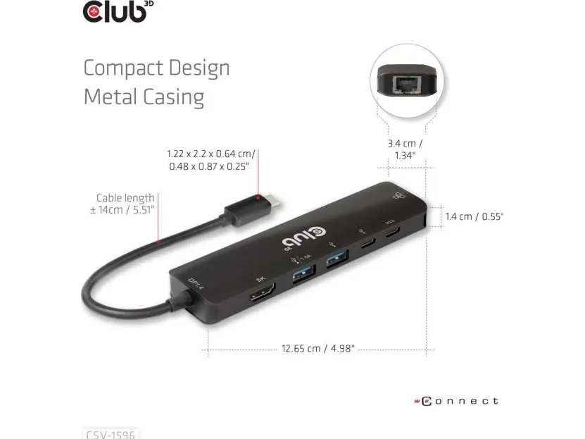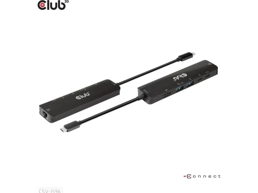 The Club 3D CSV-1596 USB-C docking station offers versatile connectivity in a compact design. This integrated cable provides seamless access to a variety of interfaces including network, audio/video, and SuperSpeed USB 3.0, enabling users to connect devices effortlessly. The docking station supports a maximum resolution of 7680 x 4320 at a refresh rate of 120 Hz, ensuring high-definition visuals for an enhanced viewing experience. Additionally, the inclusion of features such as overcurrent protection, overvoltage protection, and short circuit protection enhances safety during use.