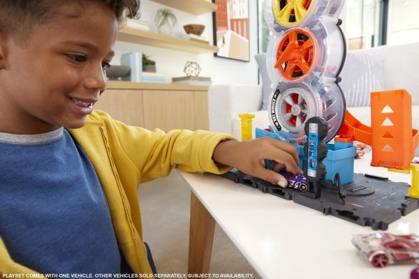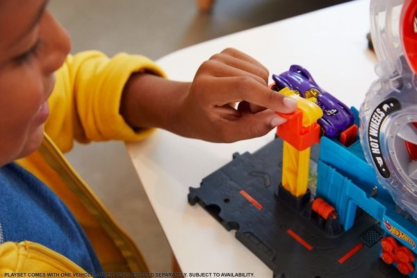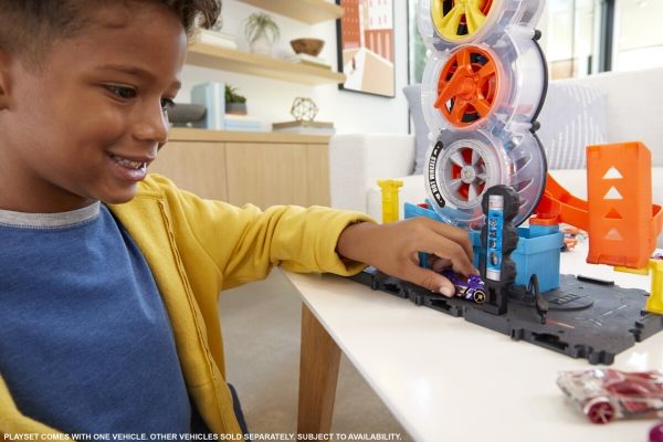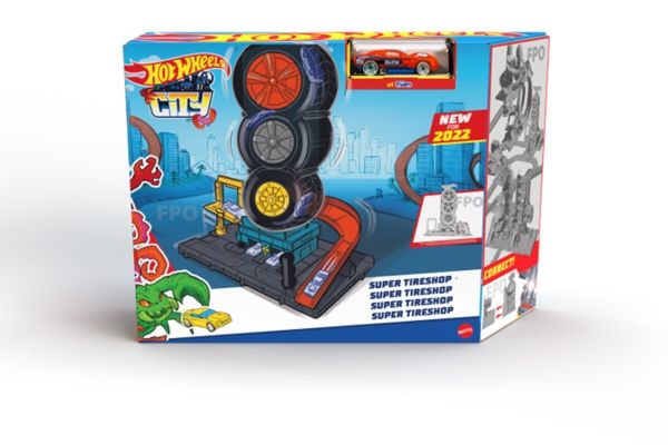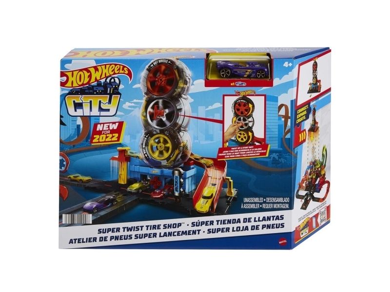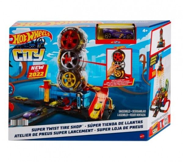 Barnen får ta sig igenom ett antal svängar i Hot Wheels™ City Super Twist Tire Shop™ när de snurrar på nyckeln i mitten och flyttar bilarna genom verkstadens genomskinliga hjul. När de når toppen gör de stunttrick nedför rampen och kör iväg mot nya äventyr. Leksetet går att koppla ihop med andra Hot Wheels®-set och kan användas med fler Hot Wheels®-bandelar, så att barnen kan bygga sin egen stunt- och racingvärld (ytterligare set och banor säljs separat). En Hot Wheels®-bil ingår, men upp till fyra bilar kan slingra sig genom däckkonstruktionen samtidigt (ytterligare bilar säljs separat). Realistiska detaljer, som en hiss som barnet aktiverar själv, snurrande däck och bensinpump utökar möjligheterna för lek. Färger och dekorationer kan variera.