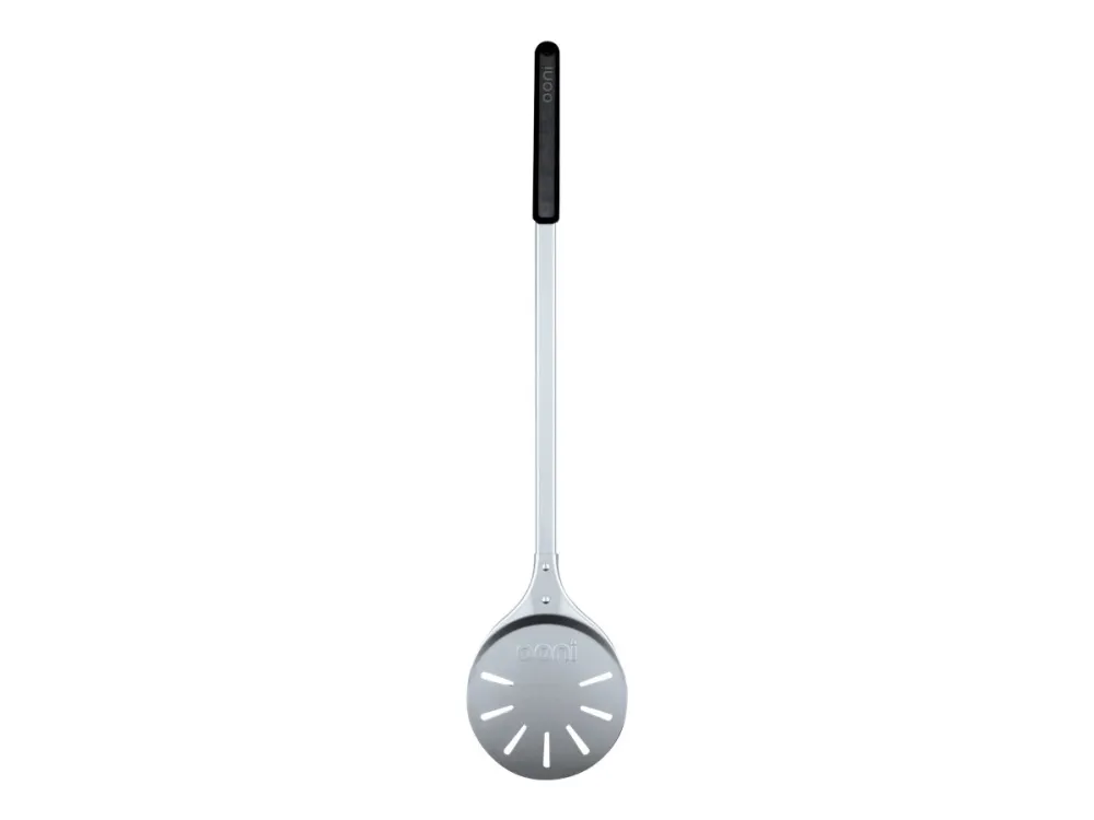 Cook your pizzas faster with the Ooni pizza turning peel, keeping pizzas in contact with the stone baking board as you spin them like a pro in your flaming-hot Ooni pizza oven. The seven-inch, durable anodized aluminum surface has a non-stick effect for sliding right under pizzas, while the perforations let excess flour fall away for a perfectly cooked pizza base.