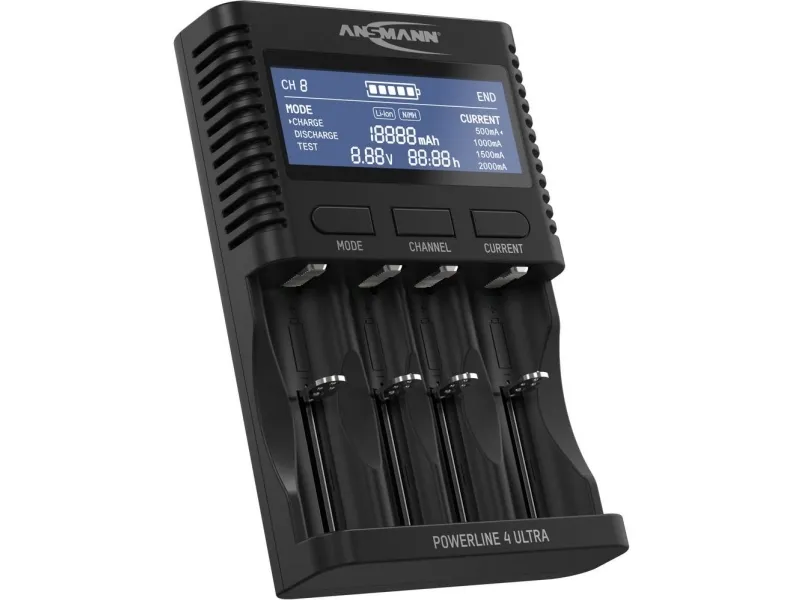Oplader Powerline 4 UltraProcessorstyret · minus-U-Delta-frakobling · ladestrøm kan indstilles · afladningsfunktion · USB-udgang · enkeltcelleovervågning · batteritest-funktion · impulsopretholdelsesladning · polaritetsbeskyttelse · kortslutningssikker · LC-displayMed den intelligente batterioplader kan op til fire NiMH-batterier i størrelserne AA og AAA, tre C-batterier, to D-batterier eller fire Li-ion batterier i størrelserne 18650 oplades samtidigt, også blandes - uafhængigt af antal, størrelse, kapacitet eller opladningsstatus. Hver af de 4 opladningspladser overvåges individuelt og oplades/aflades individuelt. Når et batteri lægges i, starter ladetilstanden og oplader batteriet helt. Derved oplades hvert enkelt batteri individuelt. Det vil sige, at batterier af forskellig type og med forskellig kapacitet og opladningsstatus kan lægges og oplades/aflades. Efter fuld opladning skifter opladeren automatisk over på impulsopretholdelsesladning og holder batter
