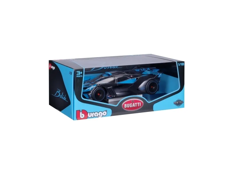 kompromisslösa hypersportbilen Bolide! Med sina 1850 hästkrafter accelererar Bugatti Bolide från 0 till 100 km/h på bara 2,17 sekunder och har en imponerande topphastighet på över 500 km/h. Bburago har återskapat Bugatti-modellen i metallgjutning i skalan 1:18 med detaljerad interiör samt rörlig motorhuv, bagageutrymme och dörrar. Den blå sportbilen är ett måste för varje Bugatti-älskare och ett blickfång i vitrinskåpet! Som leksak passar modellbilen för barn från 3 år.