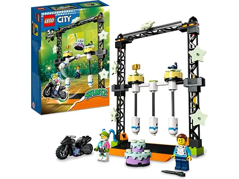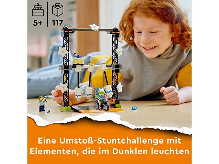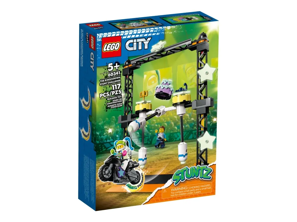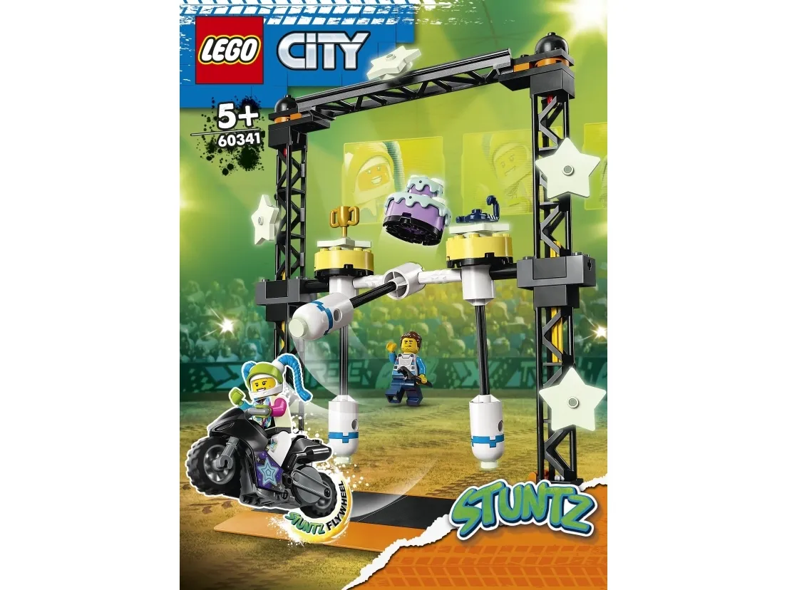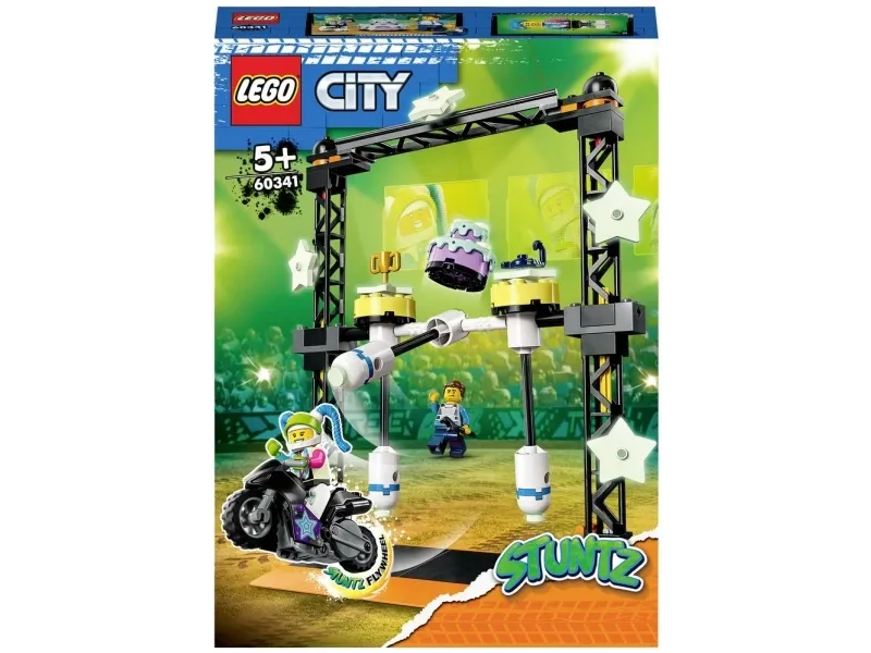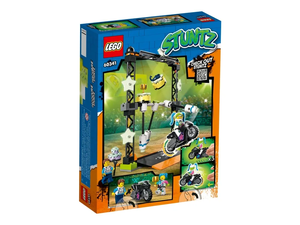 Barn som gillar att tävla kommer att älska leksetet LEGO® City Stuntutmaning med knuff (60341) med självlysande delar. Barn skickar iväg den flyghjulsdrivna motorcykeln för att träffa en pelare och vinna ett pris. Och med 2 populära karaktärer från LEGO City TV är scenen redo för roliga rollekar. Setet kan kombineras med andra set från LEGO City Stuntz serien för ännu mer stuntaction.