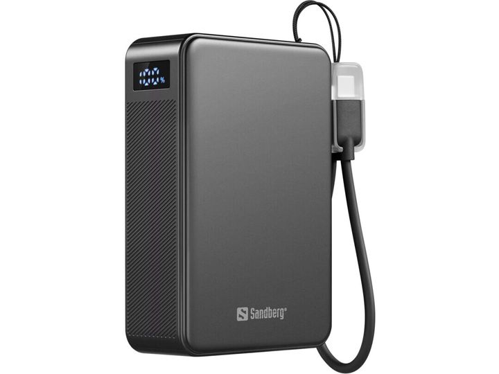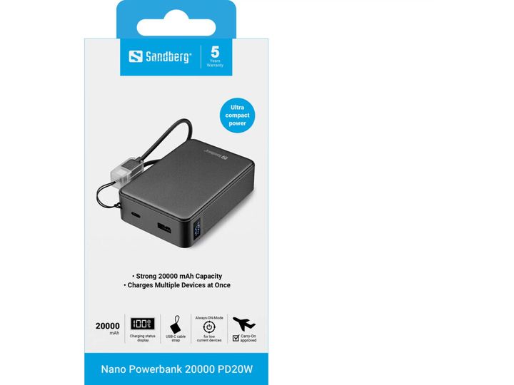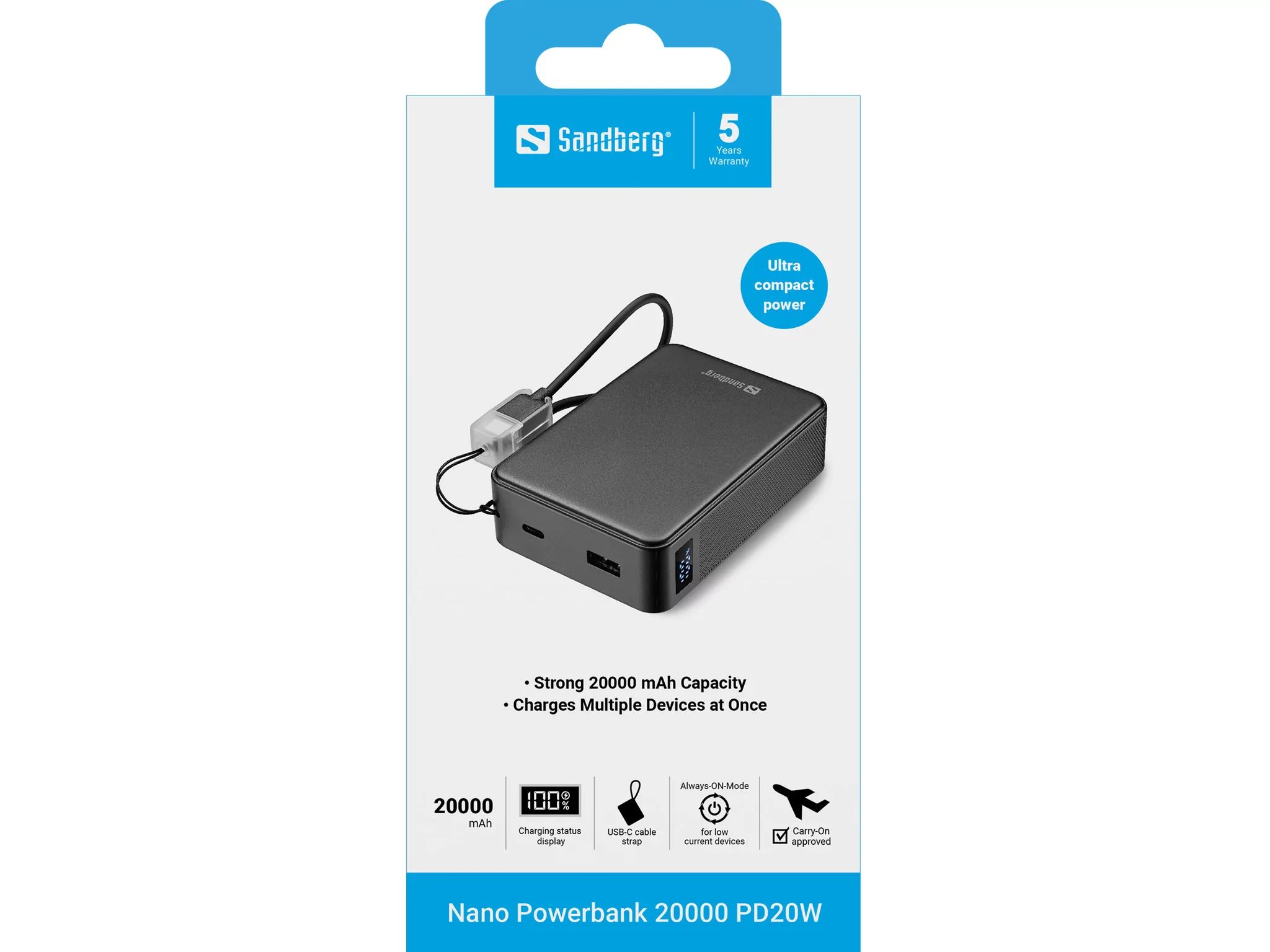 • Sandberg Nano Powerbank 20000 PD20W ger dig massiv kapacitet i ett överraskande kompakt format. Med 20000 mAh har du tillräckligt med ström för flera laddningar av dina viktigaste enheter – perfekt för resor, hektiska vardagar eller nödsituationer. Den snabba 20W PD-utgången ger effektiv laddning och både USB-C och USB-A gör det enkelt att ladda flera enheter samtidigt. Den digitala displayen visar batterinivån exakt och den medföljande USB-C-kabeln fungerar även som en praktisk handledsrem.