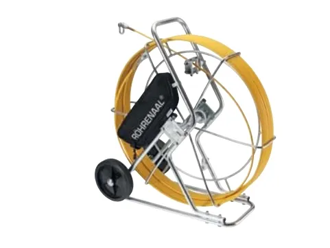 Galvanised steel tube frame, mobile on rollers, ball bearing mounted winch with integrated parking brake, complete with fibreglass rod.