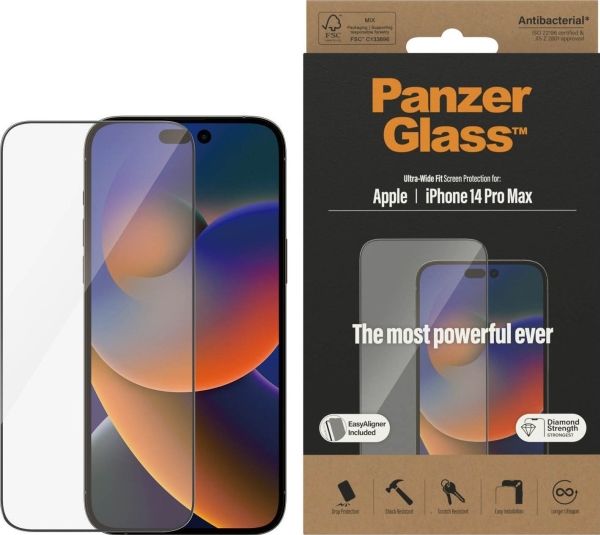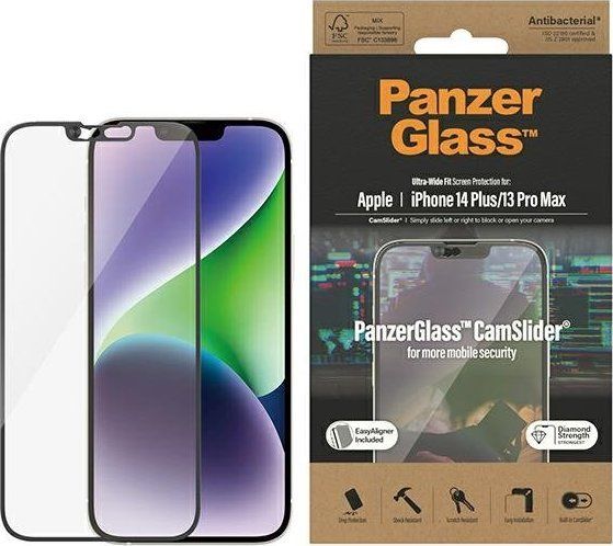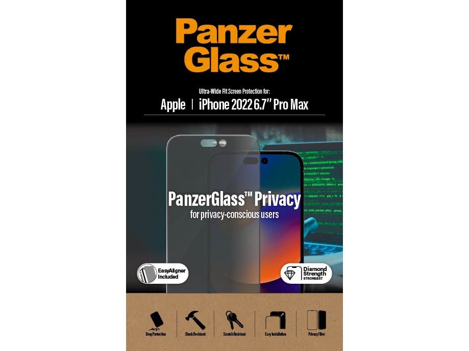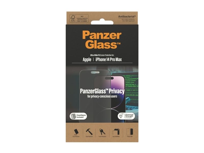Private messages. Bank details. Pin codes. With this screen protector from PanzerGlass , your secrets are safe from the prying eyes of people sitting next to you on the train, on the bus or in the office. The specially designed privacy filter renders the content of your screen virtually invisible to everyone except you.Accidental bumps against sharp-edged dangers in your pocket or crushing falls onto stone-hard pavements are also no match for this scratch and shock-resistant screen protector, which provides high-level drop protection. It even has a smudge-free coating with antibacterial effect that reduces traces of fingerprints and kills up to 99.99% of all common surface bacteria.The screen protector comes with an EasyAligner that makes installation so simple you can do it perfectly on the first attempt… even if you're all thumbs. And once it's installed, you'll never again fear the sight of your phone tumbling to the ground. This may not happen, but if it does, you'll regret not having clicked "add to cart".The Ultra-Wide Fit screen protector covers the entire front surface of your phone, while still leaving room for a case. It provides a complete and crystal-clear view of your screen and comes in FSC-certified packaging that can be recycled.