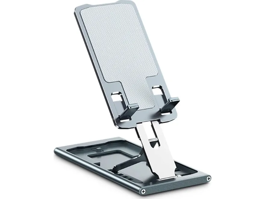 The foldable holder MTS-105 offers all mobile phones and tablets, up to a size of 12" and 750g, a secure stand and can be tilted in 5 angles from 40°-70°. Height adjustment is problem-free possible in 6 steps by simply pushing.