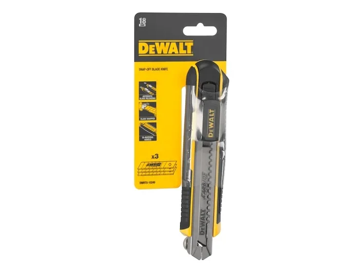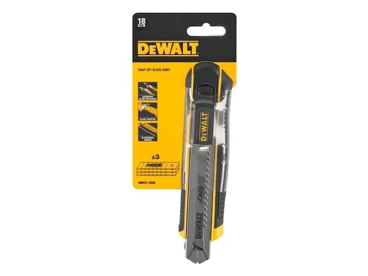 The DEWALT® 18 mm Snap-off Knife has an auto-locking slider for blade adjustments. The integrated blade snapper ensures you'll have a sharp cutting edge without having to manually change out a blade. The autoload function automatically draws a blade from the cartridge which can hold up to 6 blades. Supplied with 3 x Carbide Blades which can last up to 10 x longer than a standard conventional Carbon Steel BladeDeWALT DWHT0-10249. Blade width: 1.8 cm. Quantity per pack: 1 pc(s)