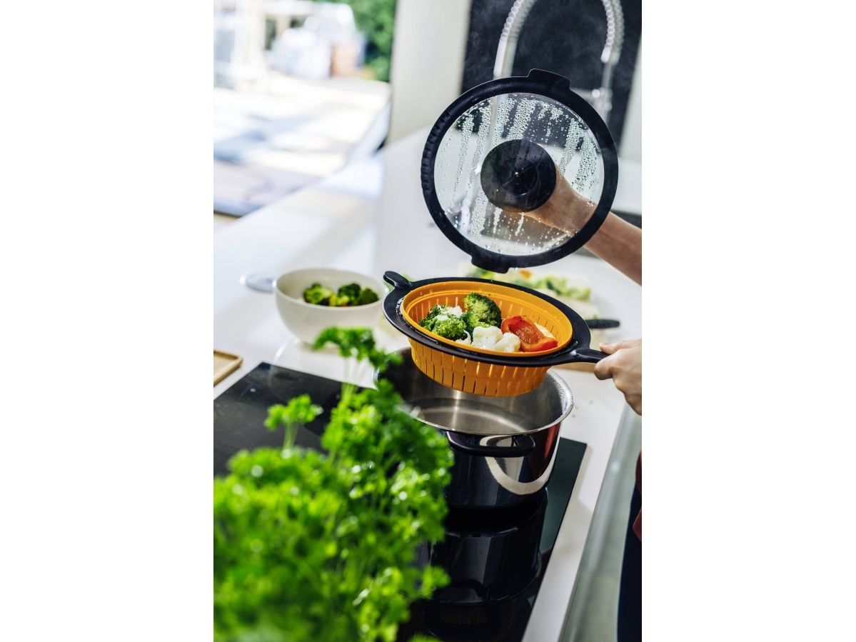 Upptäck det perfekta tillskottet till ditt kök med Fiskars FF durkslag/ångkokare. Detta mångsidiga köksverktyg är utformat för både effektivitet och användarvänlighet och är perfekt för en mängd olika kulinariska uppgifter. Oavsett om du tappar av pasta, sköljer grönsaker eller ångkokar hälsosamma rätter, garanterar den högkvalitativa silikonkonstruktionen hållbarhet och tillförlitlighet. Den tål maskindisk och utlovar enkel rengöring, vilket gör den till ett praktiskt val för upptagna kockar. Med sina kompakta mått och lätta design integreras den sömlöst i alla kök och förhöjer din matlagningsupplevelse utan att ta upp värdefullt utrymme. Upplev blandningen av funktionalitet och bekvämlighet med Fiskars FF durkslag/ångkokare.