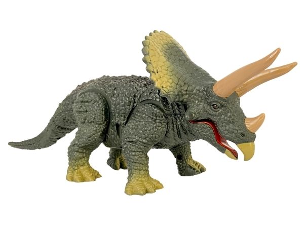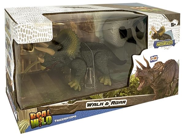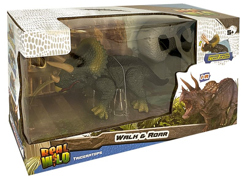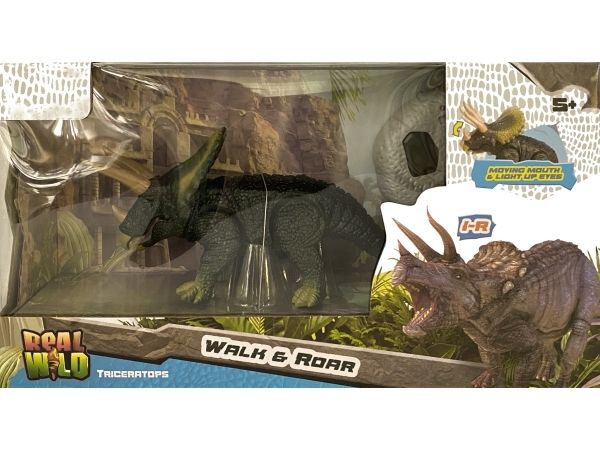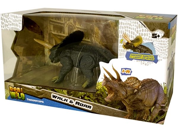 Ögonen lyser på den IR-kontrollerade Triceratops från REAL WILD, när den är in action. Den rör sig framåt på ett verklighetstroget sätt. Triceratops mun öppnas och stängs automatiskt, vilket ger realistiska Dino-ljud.