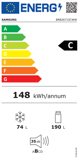Samsung BRB6000. Total net capacity: 264 L, Climate class: SN-T, Noise level: 35 dB. Fridge net capacity: 190 L, No Frost (fridge), Fridge interior light, Fridge number of shelves/baskets: 3, Number of vegetable drawers: 2. Freezer net capacity: 74 L, Freezing capacity: 6 kg/24h, No Frost (freezer). Fresh zone compartment. Energy efficiency class: C, Annual energy consumption: 148 kWh. Product colour: White