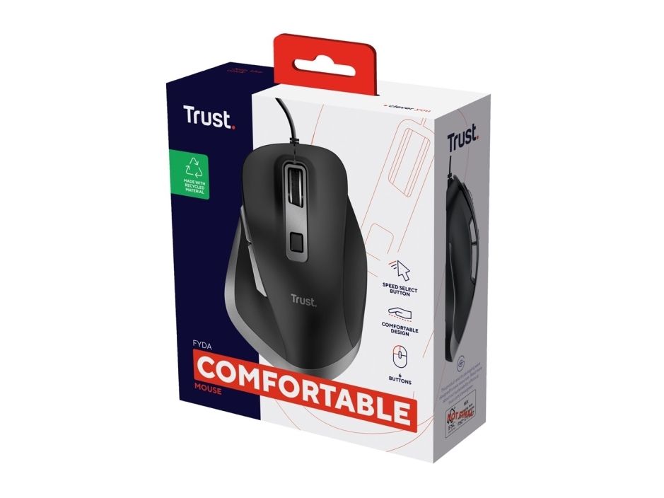 Trust Fyda Comfort - Mus - eco - högerhänt - optisk - 6 knappar - kabelansluten - USB 2.0 - svart