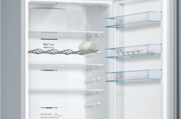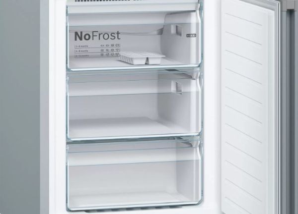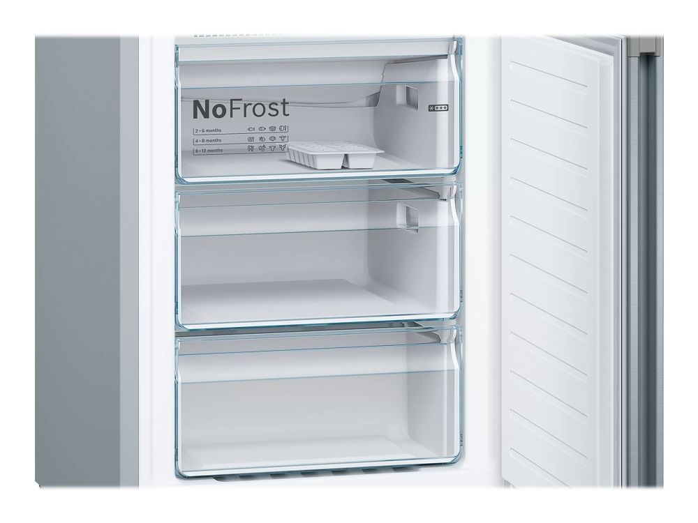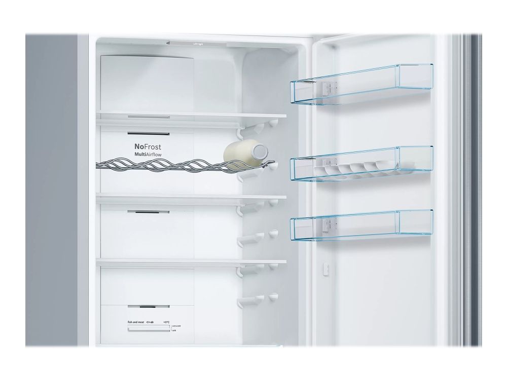 The Bosch Serie | 4 KGN39VLEB refrigerator/freezer combines modern design with versatility, offering ample storage and advanced features for all your food preservation needs. With a total net capacity of 368 liters, this appliance allows for organized storage, accommodating various food items effortlessly. The innovative vitaFresh zone maintains optimal humidity levels to keep fruits and vegetables fresh for longer, enhancing your culinary experience. This refrigerator is equipped with a frost-free cooling system, saving you time and effort on defrosting. It includes three freezer drawers and features such as a temperature alert for added security. The LED interior lighting ensures visibility, while the energy-efficient design, consuming 238.35 kWh annually, contributes to lower energy bills. Enjoy a delightful combination of style and functionality with Bosch, designed to fit seamlessly in any kitchen setting.