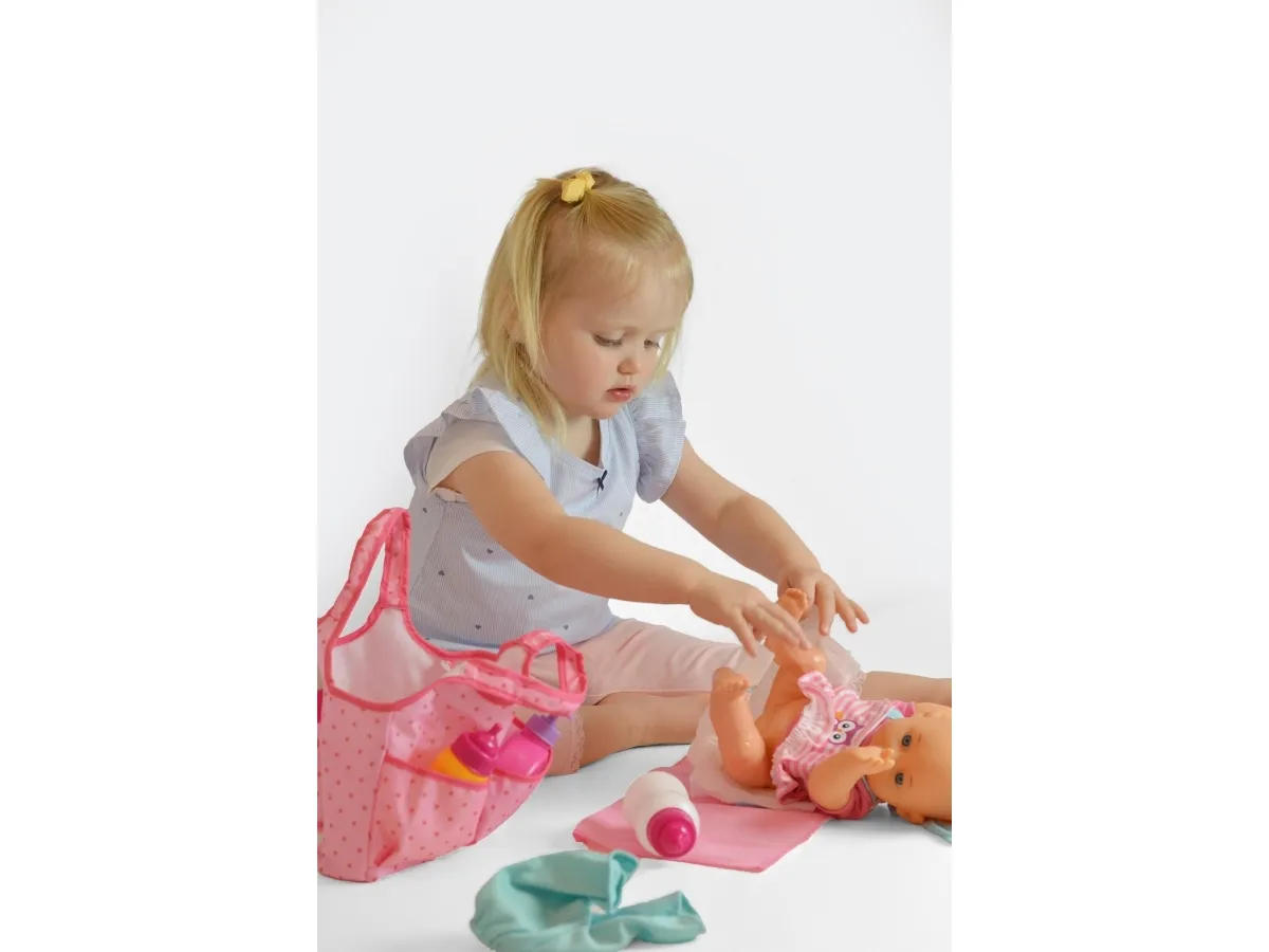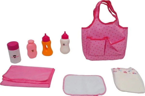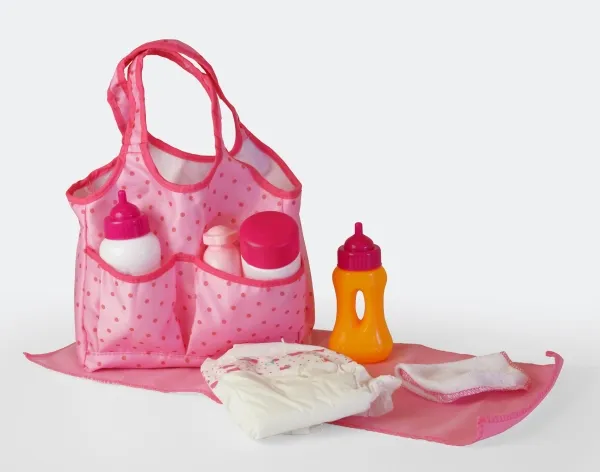 Var säker på att du alltid har dockans alla viktiga hjälpmedel med dig på resan! Den smarta och snygga blöjflaskan har allt det som din docka kan behöva, och den kan enkelt bäras på axeln. Paketet innehåller: Rosa blöjväska, mjölk-nappflaska, drickflaska, förvaringsflaska, blöja och handdukar. Från 3 år.