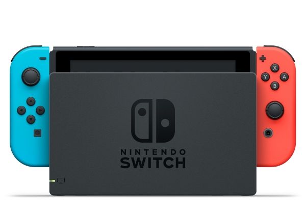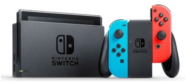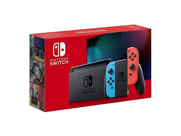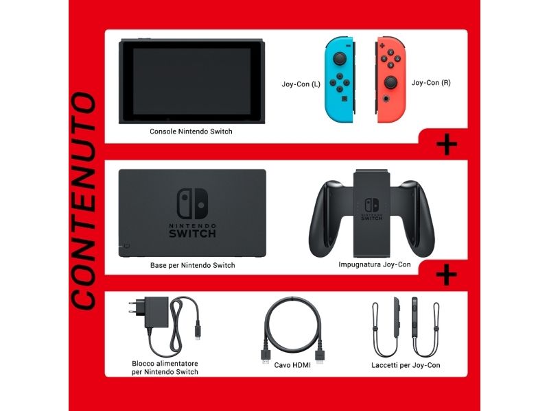 Det här paketet innehåller spelkonsolen Nintendo Switch och en svart dockningsstation samt en blå och en röd Joy-Con. Paketet innehåller alla kablar och adaptrar som krävs för att komma igång.
