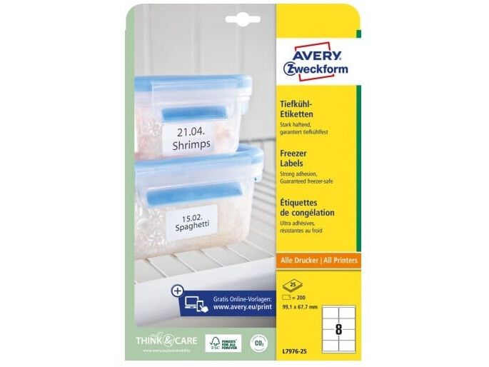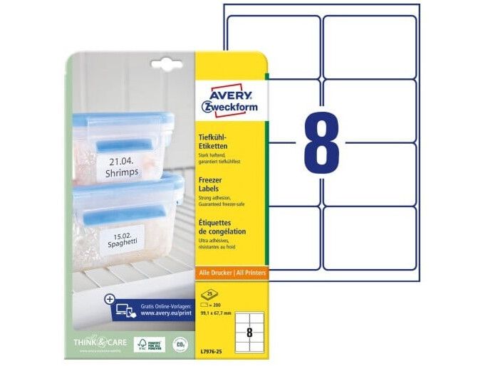 Etiketter Avery 99,1 x 67,7 mm, A4, vita - frysta etiketter för märkning av frysta livsmedel - (25 ark x 8 st.)