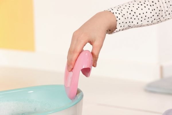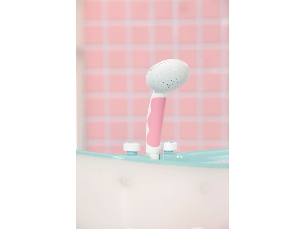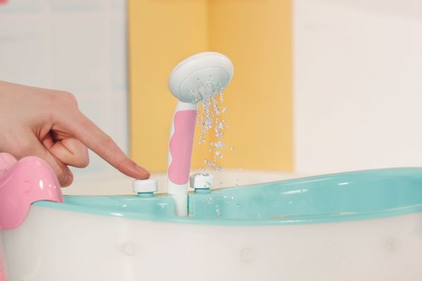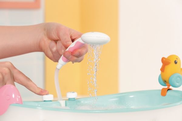 Duschknappen aktiverar den rosa och vita duschen. Om badkaret är tomt kan du höra plask- och typiska vattenljud. Om badkaret redan är förfyllt med vatten rinner vattnet genom duschmunstycket, som du kan vända mot badkaret så att det inte rinner ut något vatten utanför badkaret. Du kan också ta ut slangen från duschen, så att du kan tvätta BABY born ordentligt eller göra Bror ännu blötare.