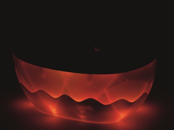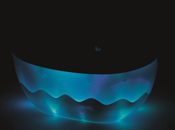 Badkaret har vattenblå insida och vitt och formad som en våg på utsidan. När du trycker på ljusknappen på sidan av duschen börjar badkarets utsida att lysa upp i växlande färger.