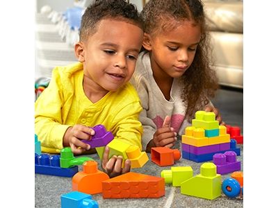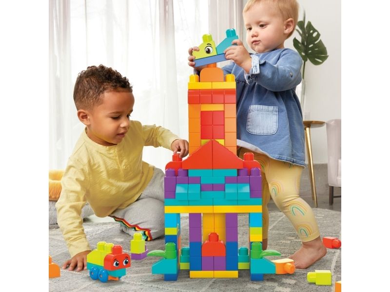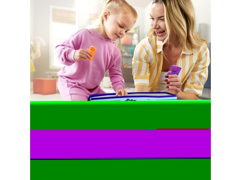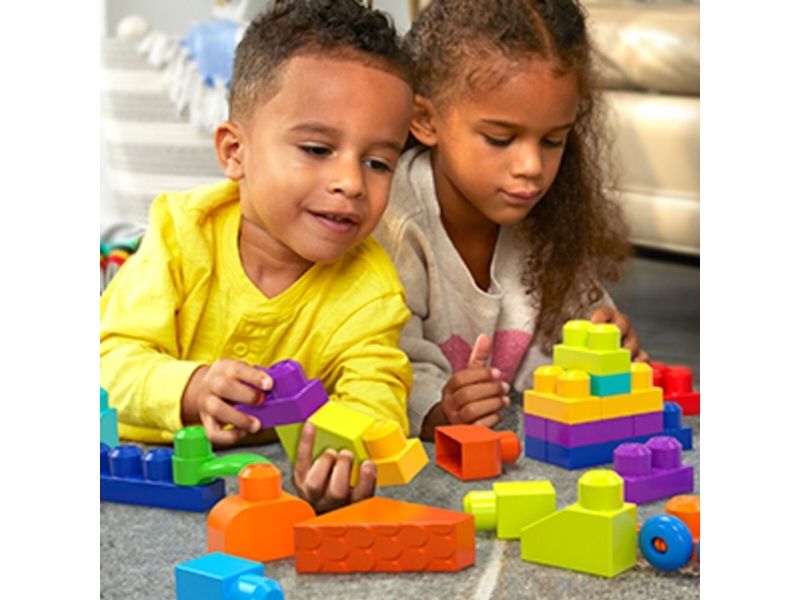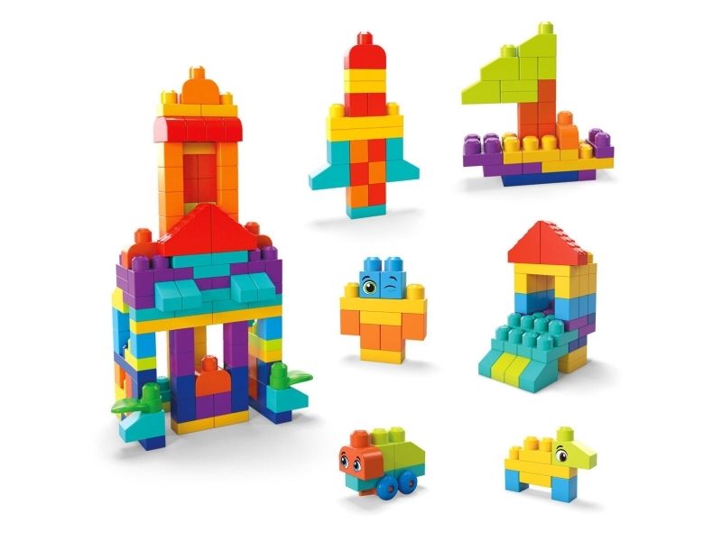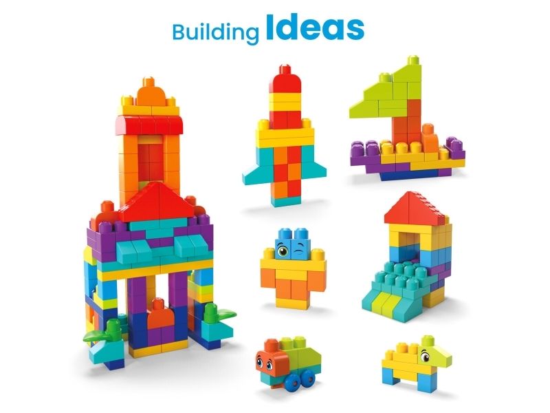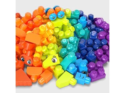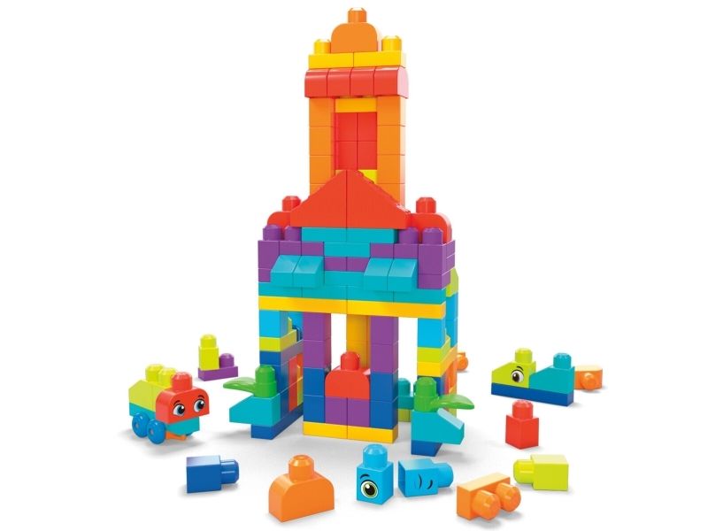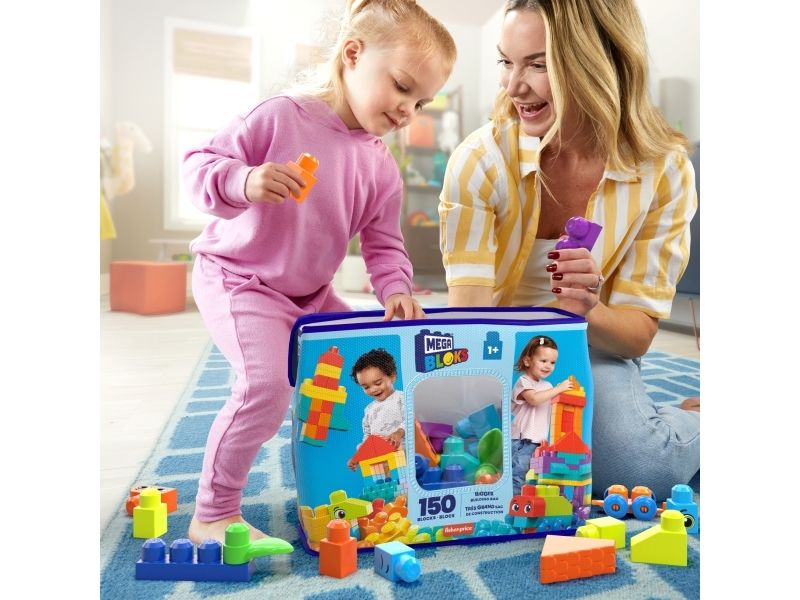 Produktbeskrivning: Släpp loss den lilla byggarens fantasi med den större byggväskan, fylld med 150 stora och färgglada byggklossar och specialdelar som klossar dekorerade med ögon, lövklossar, takklossar och 1 hjulbas. Klossarna är greppvänliga och enkla att stapla för att barnet ska kunna utveckla sin finmotorik, kreativitet och fantasi. Klossarna förvaras smidigt i den återanvändbara väskan när barnet har lekt klart.