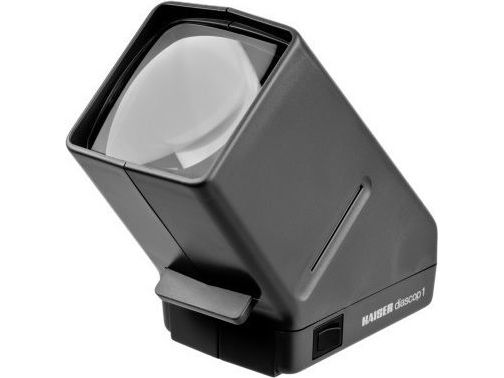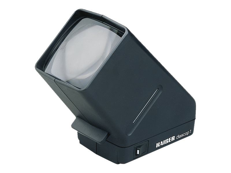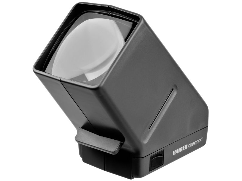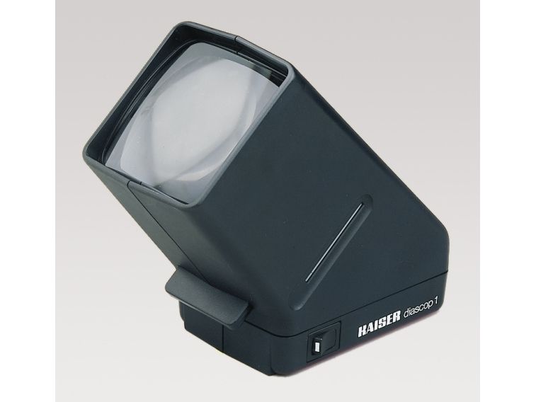Slide viewer with 2x magnifying lens for framed slides, 5 x 5 cm (2 x 2 in.), and uncut film strips in protective sleeves.
