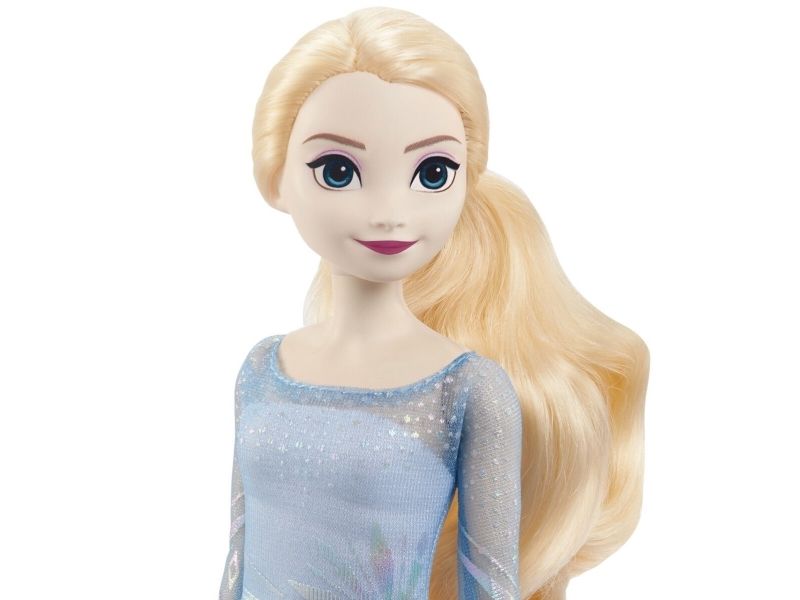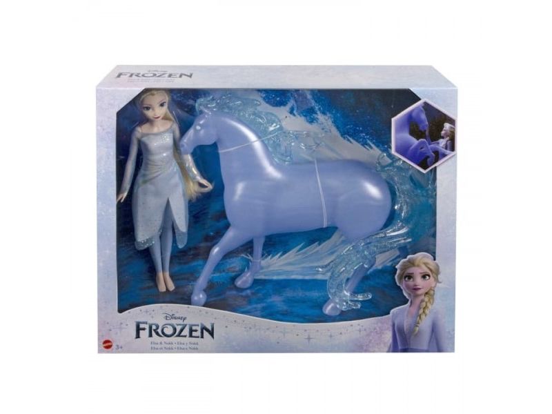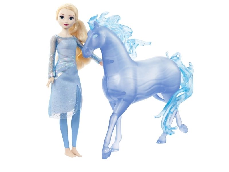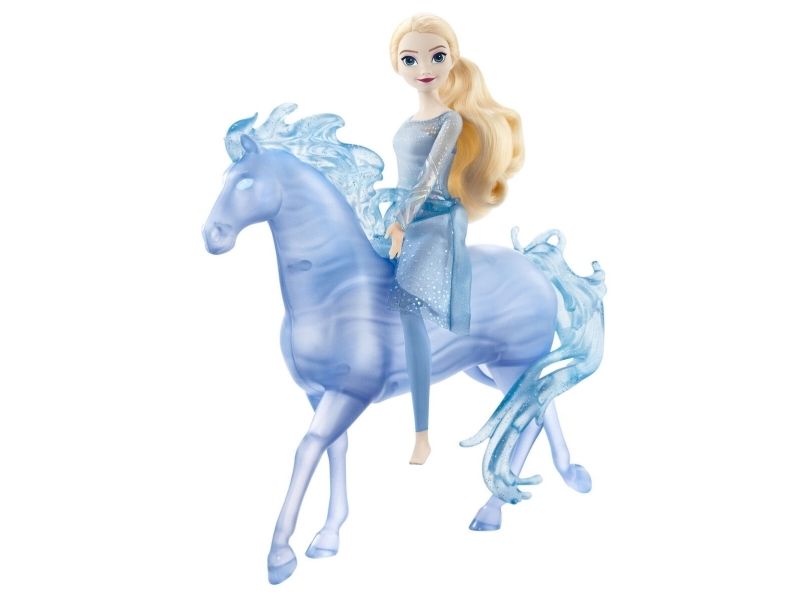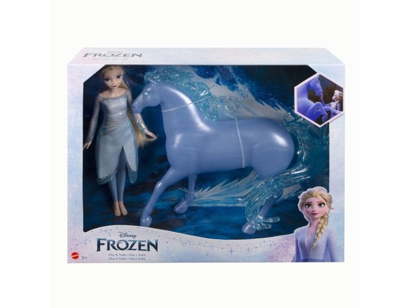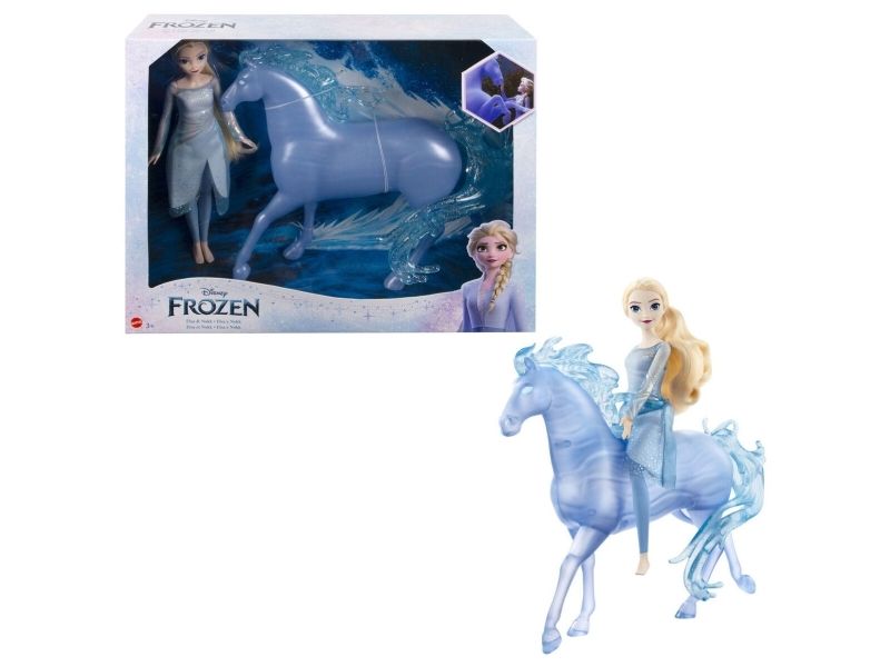 Elsa och vattenvarelsen Nokk, inspirerade av den episka Disneyfilmen Frost 2, är redo för äventyr utanför Arendal! Den ställbara Elsa-modedockan har böjbara knän så hon kan rida och hon är klädd i sin välkända ljusblå klänning från filmen. Den mytiska hästformade vattenanden Nokk glittrar i isblå nyanser. Dockan kan inte stå utan hjälp. Färger och dekorationer kan variera.