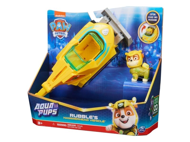 Samarbeta med Rubble på actionfyllda räddningsuppdrag i hans Aqua Pups-hammarhajräddningsfordon! Rubble som har på sig sin gula Aqua Pups-våtdräkt och -hjälm är redo för superladdade räddningar i låtsashaven! Rubbles hammarhajfordon har en spännande förvandlingsfunktion! Förvandla fordonet till räddningsläge genom att helt enkelt placera Rubble i förarsätet och dra för taket så att vingen och ryggfenan aktiveras. När det dyker upp problem kan du snabbt förvandla till räddningsläge och susa iväg på räddningsuppdrag. Använd sen den utfällbara borrsvansen och hammarhajsbladet för att röja undan alla hinder! Skapa PAW-tastiska äventyr med Rubble’s Hammerhead Shark Rescue-fordon! Sen, för att få ännu fler spännande serieinspirerade uppdrag, kan du samla på alla Aqua Pups-figurer och -leksaksfordon (säljs separat), för oändliga timmar med actionfyllda äventyr! Med PAW Patrol-leksaker kan barn utforska sin fantasi och utveckla sina motoriska färdigheter genom låtsaslek när de väcker liv i sina favoritscener från serien! Actionfigurer, leksaksbilar, lekset och gosedjur från PAW Patrol är perfekta leksaker för pojkar och flickor från 3 år – så nu är det dags bjuda hem spänningen från PAW Patrol: Aqua Pups!