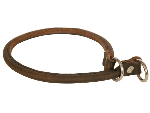 Rundsytt dressyrhalsband av strypmodell, nitat i ändarna. Det halvrunda, dubbelsydda mjuka halsbandet är tillverkat av svensk miljöcertifierat läder av oxhud och garanterat kromfritt.