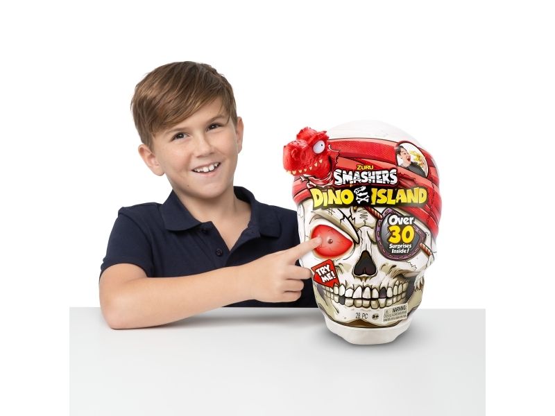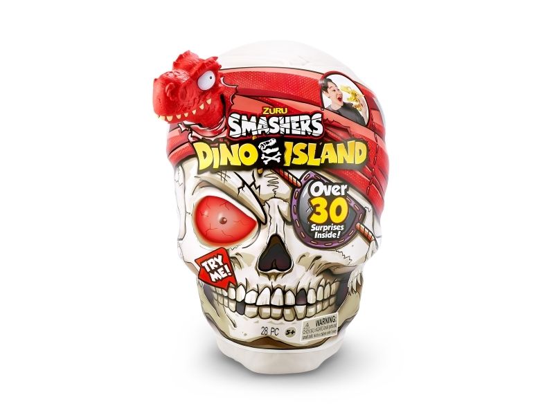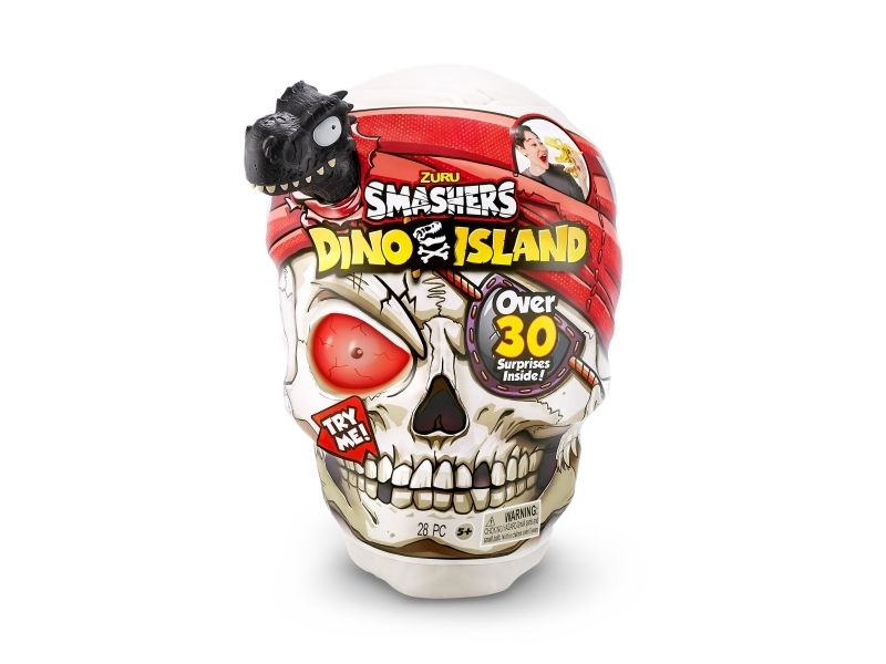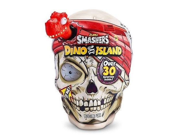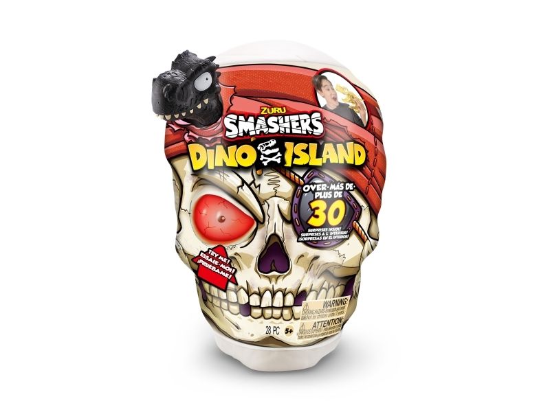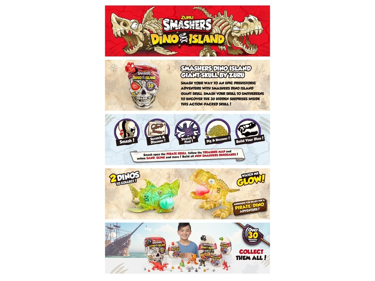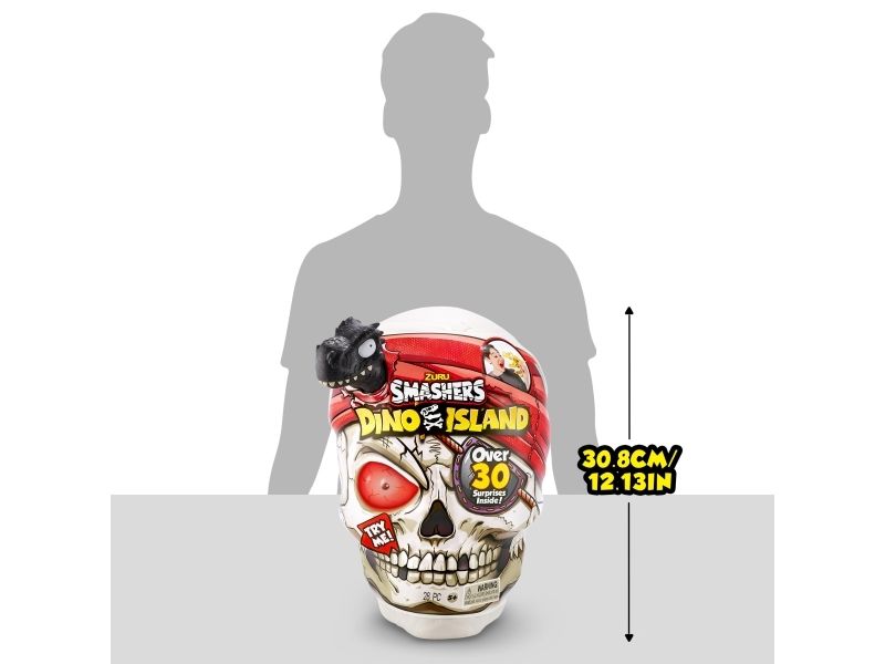 Slå dig till ett episkt förhistoriskt äventyr med Smashers Dino Island Giant Skull. Kross din skalle i små bitar för att hitta de 30 dolda överraskningarna inuti denna actionfyllda skalle! Sök igenom sockervaddsskum och superstretchigt slime för att hitta dina dinobitar! Se upp för en irriterande piratkaraktär och 5 episka smashers mini-ägg med exklusiva karaktärer! Konstruera dina dinodelar och placera Giant Skull-ögat i din dinos mun för att höra det ryta. Det finns två förhistoriska bestar och över 20 minifigurer att krossa och samla! Vad väntar du på! Upptäck din nya farligt episka Smashers Dino!
