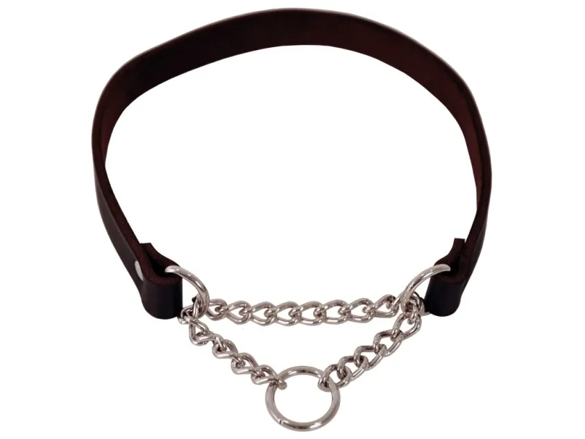 Läderhalsband i halvstrypsmodell med kedja. Halsbandet är tillverkat i mjukt läder som är skonsamt mot hundens päls. Vegetabiliskt garvat läder av hög kvalitet, giftfritt. Tillverkat i EU.