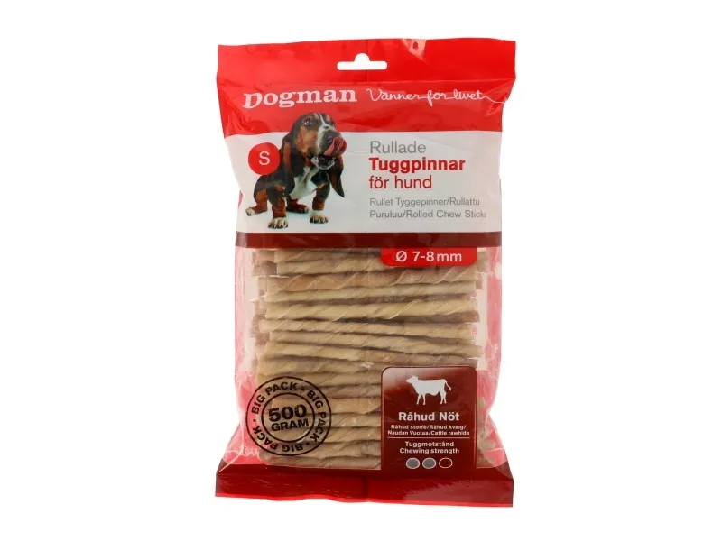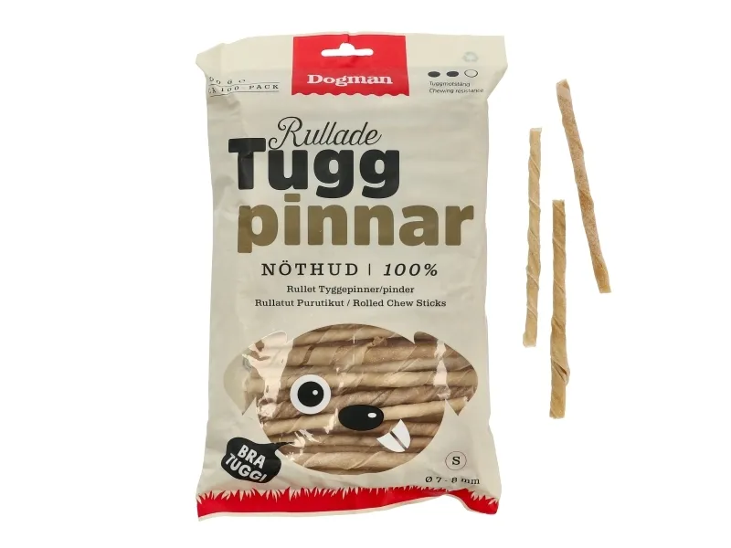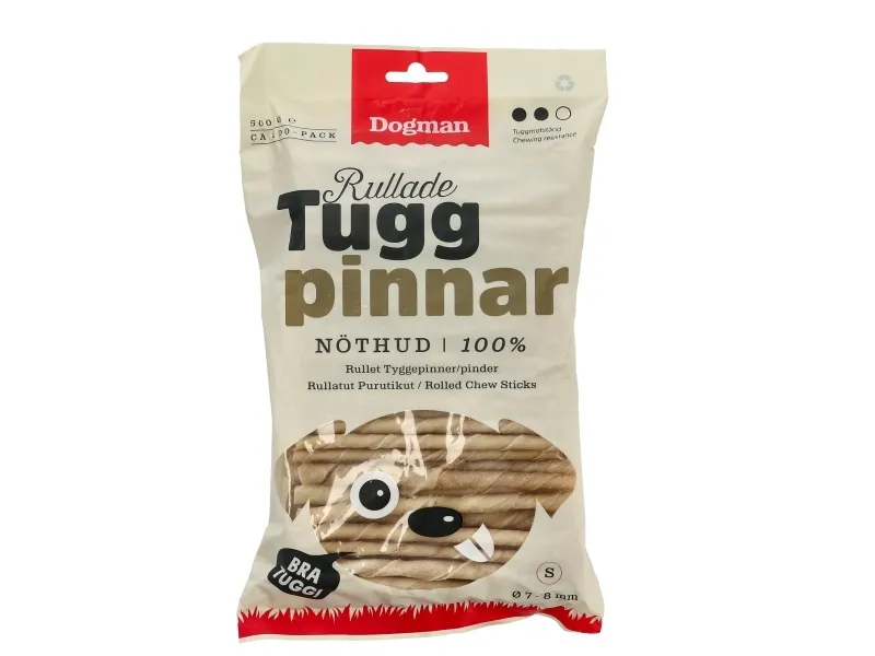 Naturliga tuggpinnar av högkvalitativ, obehandlad och rullad råhud. Förlänger tuggtiden, tillgodoser tuggbehovet och bidrar till en sund tandhälsa. Håll alltid hunden under uppsikt när den tuggar på tuggben.