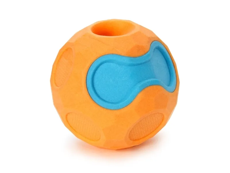 Ojämn boll av TPR foam. Studsar bra på land och flyter perfekt i vatten. Finns en ögla så att man kan fästa i en lina om man är rädd att bollen flyter iväg.