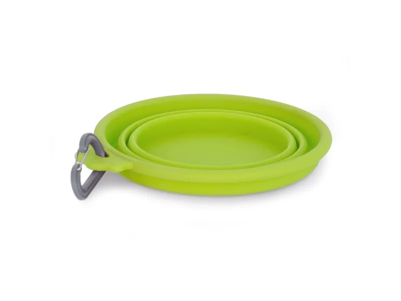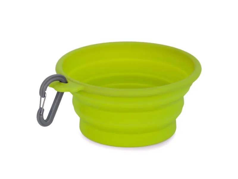 Hopfällbar skål i extra mjuk och flexibel silikon. Perfekt att ta med sig på resan. Lätt att fästa på t.ex. en lina eller byxor med hjälp av den medföljande karbinhaken.